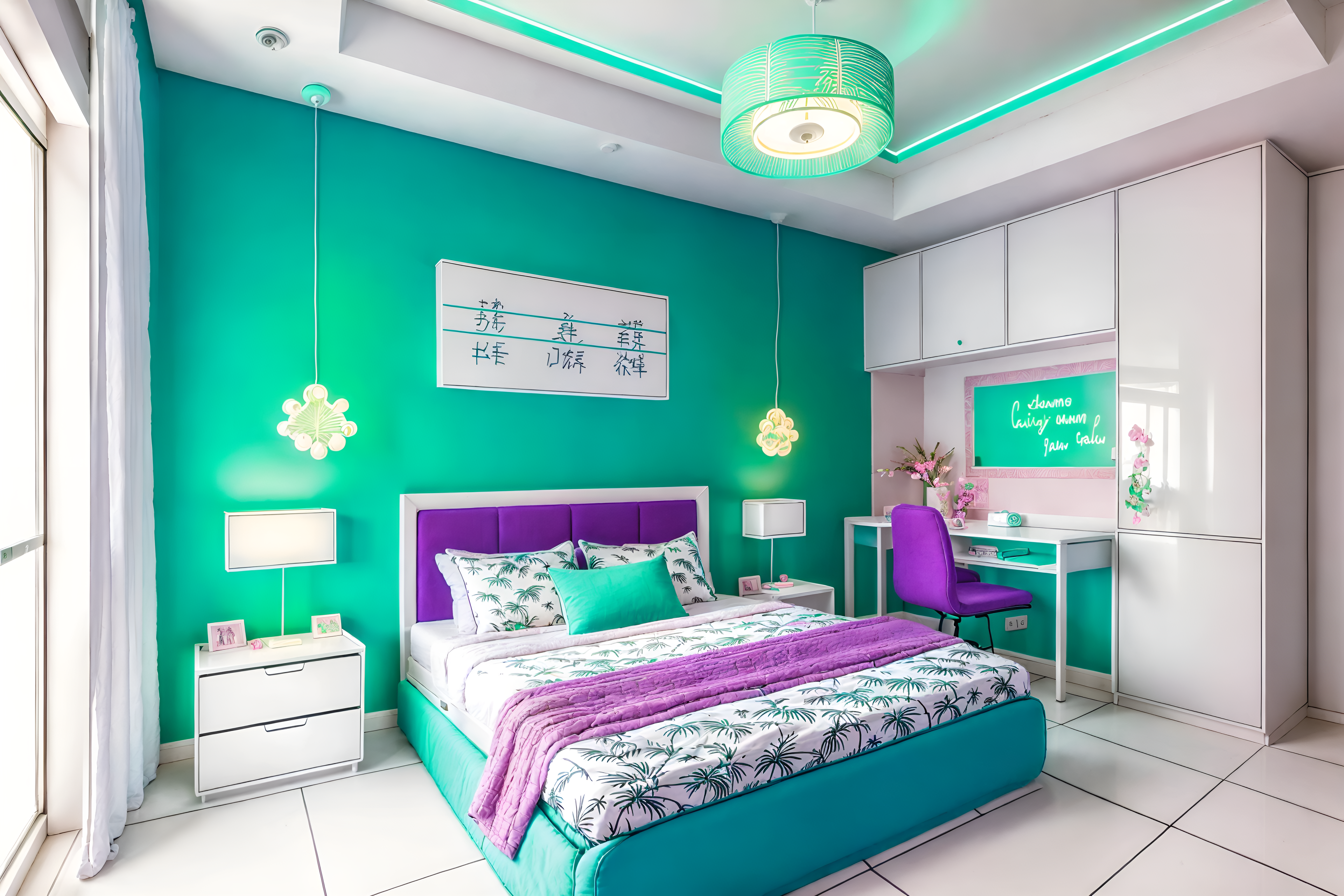photo from pinterest of vaporwave-style interior designed (kids room interior) with storage bench or ottoman and bed and mirror and night light and dresser closet and accent chair and kids desk and bedside table or night stand. . with japanese letters on wall and white square bathroom tiles and palm trees and teal colors and palm trees and neon glow and white square bathroom tiles and purple lights. . cinematic photo, highly detailed, cinematic lighting, ultra-detailed, ultrarealistic, photorealism, 8k. trending on pinterest. vaporwave interior design style. masterpiece, cinematic light, ultrarealistic+, photorealistic+, 8k, raw photo, realistic, sharp focus on eyes, (symmetrical eyes), (intact eyes), hyperrealistic, highest quality, best quality, , highly detailed, masterpiece, best quality, extremely detailed 8k wallpaper, masterpiece, best quality, ultra-detailed, best shadow, detailed background, detailed face, detailed eyes, high contrast, best illumination, detailed face, dulux, caustic, dynamic angle, detailed glow. dramatic lighting. highly detailed, insanely detailed hair, symmetrical, intricate details, professionally retouched, 8k high definition. strong bokeh. award winning photo.