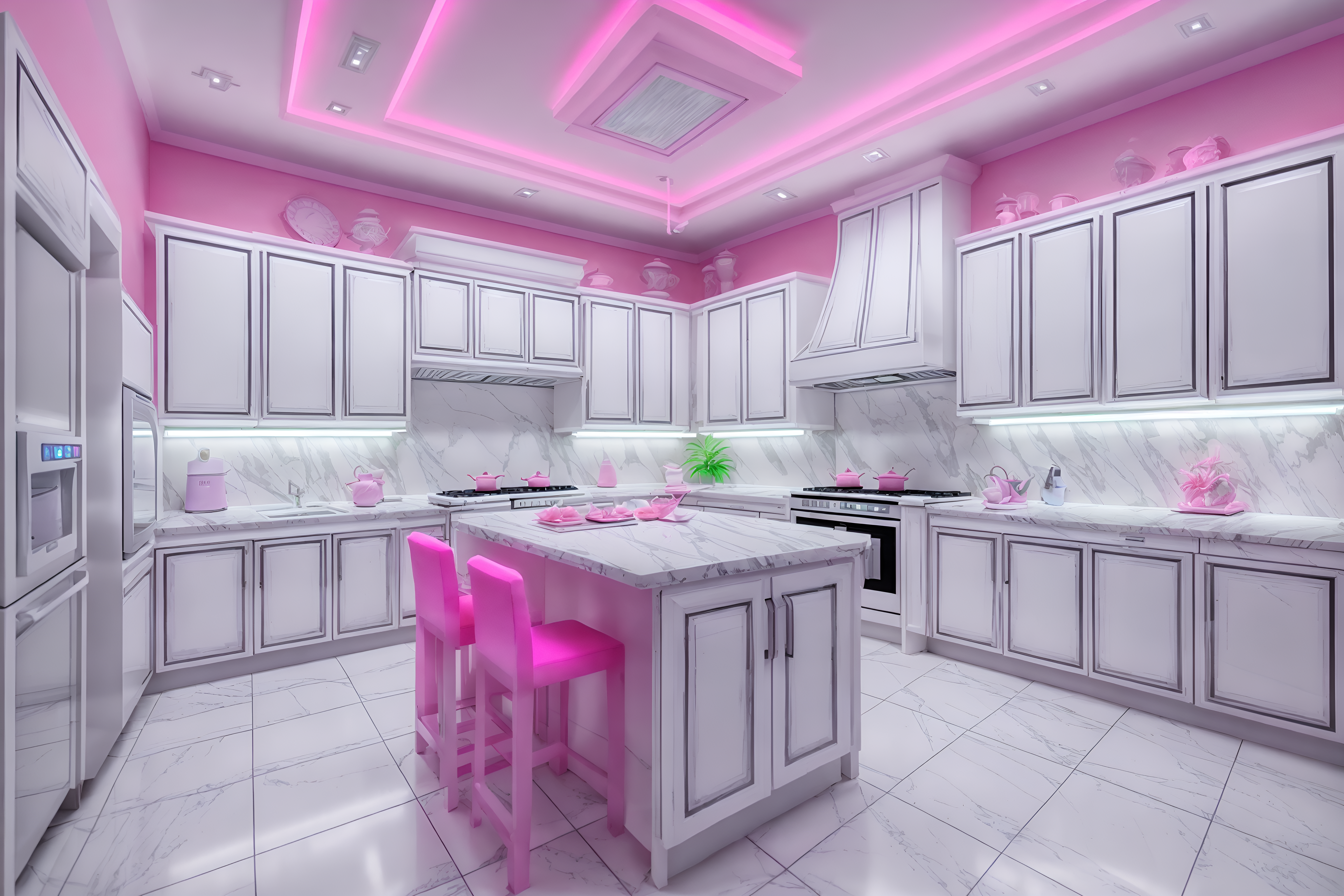 photo from pinterest of vaporwave-style interior designed (kitchen interior) with kitchen cabinets and plant and sink and refrigerator and stove and worktops and kitchen cabinets. . with neon glow and purple lights and bright pink and neon glow and white roman statues, white roman sculptures, white roman columns, white roman pillars in the center of the room, and washed out colors and white square bathroom tiles and palm trees. . cinematic photo, highly detailed, cinematic lighting, ultra-detailed, ultrarealistic, photorealism, 8k. trending on pinterest. vaporwave interior design style. masterpiece, cinematic light, ultrarealistic+, photorealistic+, 8k, raw photo, realistic, sharp focus on eyes, (symmetrical eyes), (intact eyes), hyperrealistic, highest quality, best quality, , highly detailed, masterpiece, best quality, extremely detailed 8k wallpaper, masterpiece, best quality, ultra-detailed, best shadow, detailed background, detailed face, detailed eyes, high contrast, best illumination, detailed face, dulux, caustic, dynamic angle, detailed glow. dramatic lighting. highly detailed, insanely detailed hair, symmetrical, intricate details, professionally retouched, 8k high definition. strong bokeh. award winning photo.