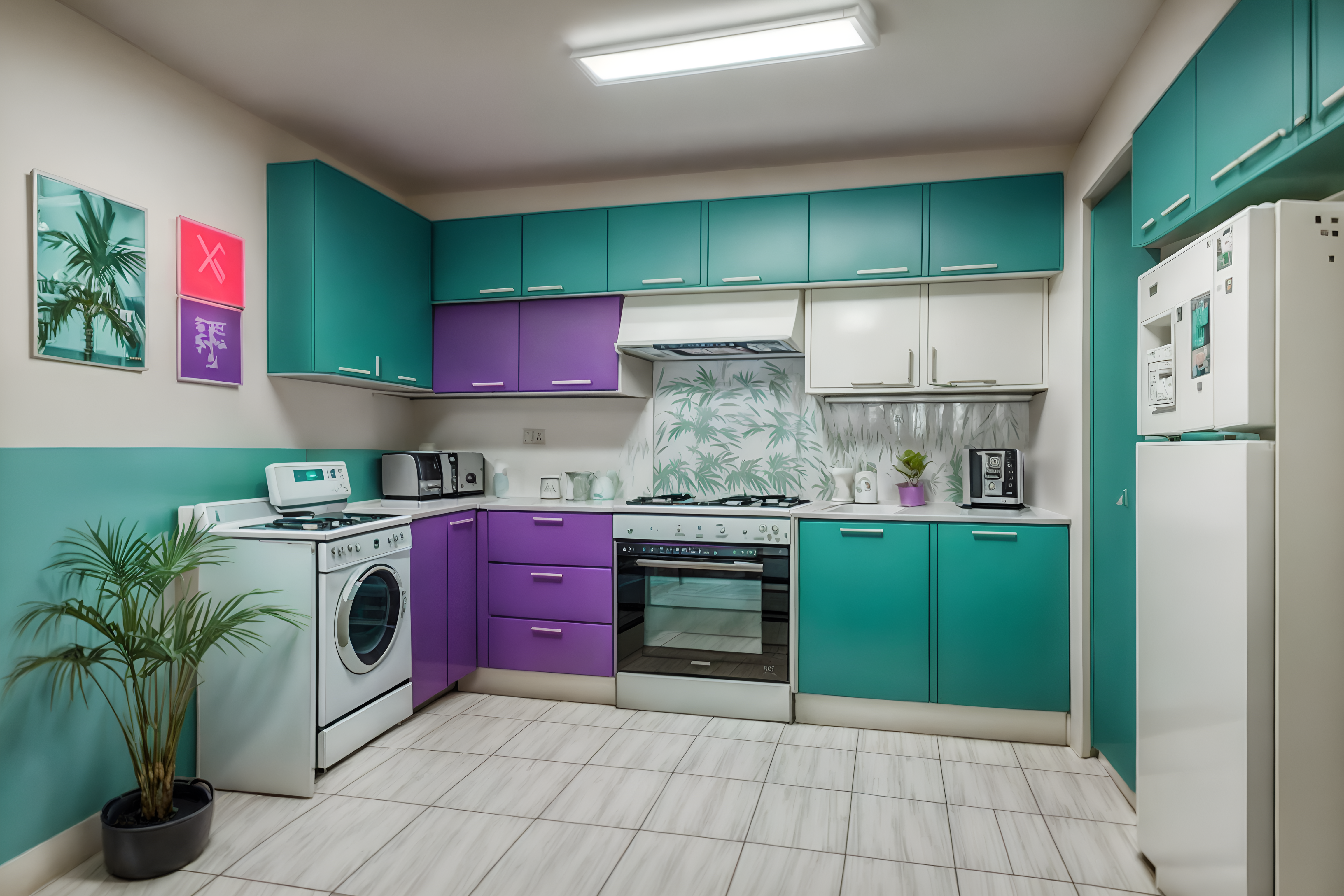 photo from pinterest of vaporwave-style interior designed (kitchen living combo interior) with sofa and furniture and electric lamps and televisions and sink and worktops and occasional tables and chairs. . with teal colors and japanese letters on wall and purple lights and washed out colors and japanese letters on wall and palm trees and palm trees and white square bathroom tiles. . cinematic photo, highly detailed, cinematic lighting, ultra-detailed, ultrarealistic, photorealism, 8k. trending on pinterest. vaporwave interior design style. masterpiece, cinematic light, ultrarealistic+, photorealistic+, 8k, raw photo, realistic, sharp focus on eyes, (symmetrical eyes), (intact eyes), hyperrealistic, highest quality, best quality, , highly detailed, masterpiece, best quality, extremely detailed 8k wallpaper, masterpiece, best quality, ultra-detailed, best shadow, detailed background, detailed face, detailed eyes, high contrast, best illumination, detailed face, dulux, caustic, dynamic angle, detailed glow. dramatic lighting. highly detailed, insanely detailed hair, symmetrical, intricate details, professionally retouched, 8k high definition. strong bokeh. award winning photo.