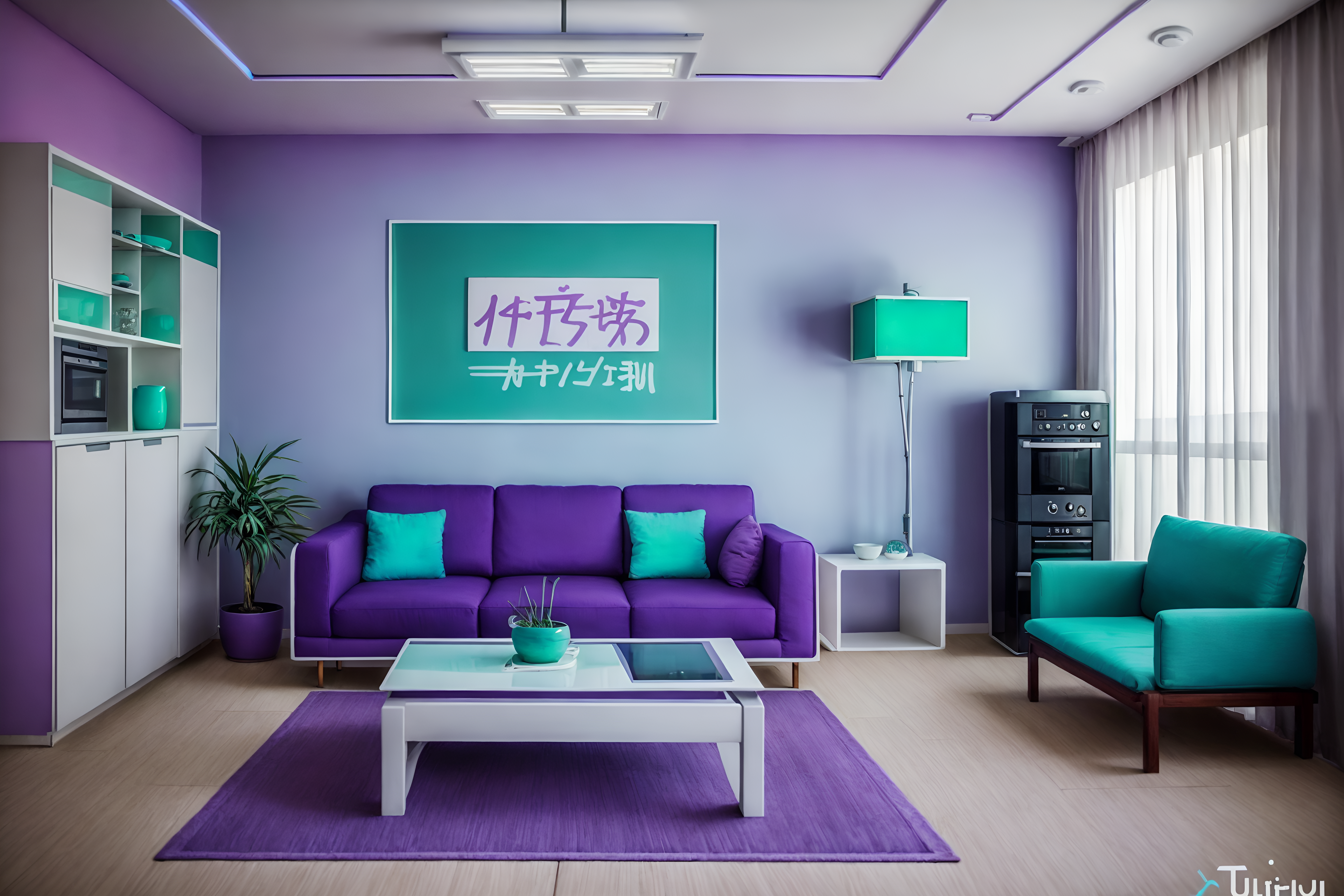photo from pinterest of vaporwave-style interior designed (kitchen living combo interior) with sofa and furniture and electric lamps and televisions and sink and worktops and occasional tables and chairs. . with teal colors and japanese letters on wall and purple lights and washed out colors and japanese letters on wall and palm trees and palm trees and white square bathroom tiles. . cinematic photo, highly detailed, cinematic lighting, ultra-detailed, ultrarealistic, photorealism, 8k. trending on pinterest. vaporwave interior design style. masterpiece, cinematic light, ultrarealistic+, photorealistic+, 8k, raw photo, realistic, sharp focus on eyes, (symmetrical eyes), (intact eyes), hyperrealistic, highest quality, best quality, , highly detailed, masterpiece, best quality, extremely detailed 8k wallpaper, masterpiece, best quality, ultra-detailed, best shadow, detailed background, detailed face, detailed eyes, high contrast, best illumination, detailed face, dulux, caustic, dynamic angle, detailed glow. dramatic lighting. highly detailed, insanely detailed hair, symmetrical, intricate details, professionally retouched, 8k high definition. strong bokeh. award winning photo.