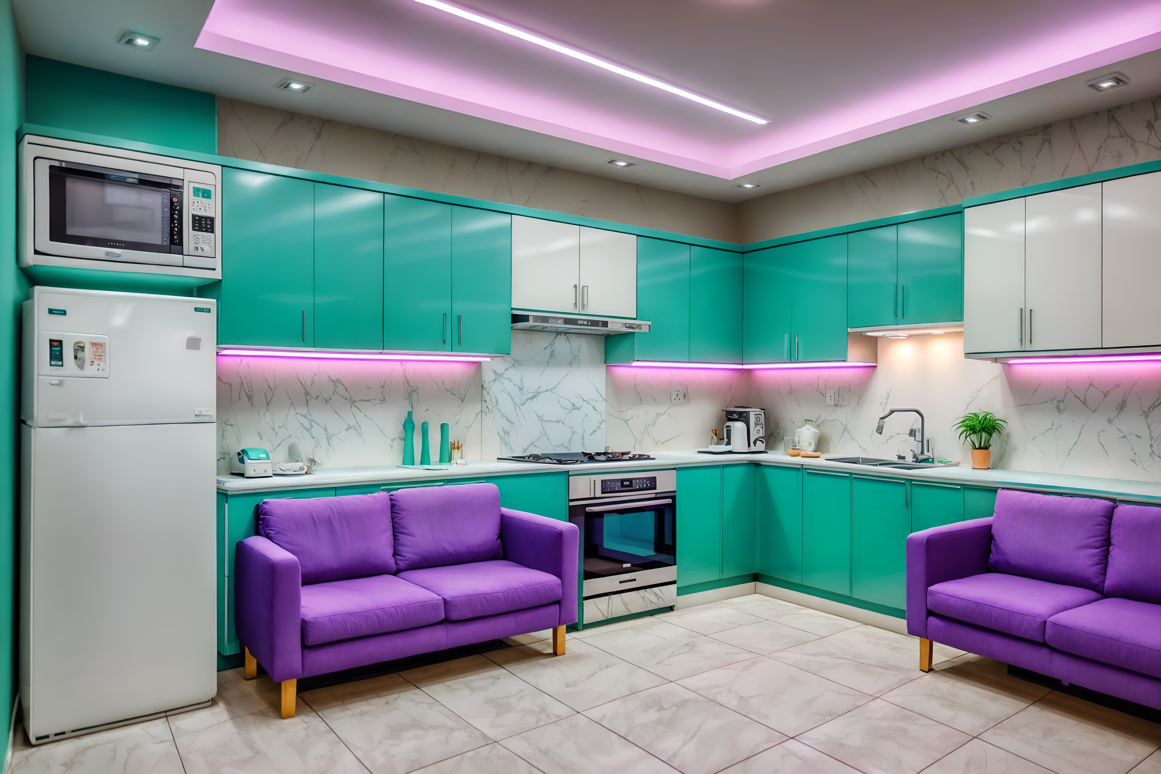photo from pinterest of vaporwave-style interior designed (kitchen living combo interior) with sofa and furniture and electric lamps and televisions and sink and worktops and occasional tables and chairs. . with teal colors and japanese letters on wall and purple lights and washed out colors and japanese letters on wall and palm trees and palm trees and white square bathroom tiles. . cinematic photo, highly detailed, cinematic lighting, ultra-detailed, ultrarealistic, photorealism, 8k. trending on pinterest. vaporwave interior design style. masterpiece, cinematic light, ultrarealistic+, photorealistic+, 8k, raw photo, realistic, sharp focus on eyes, (symmetrical eyes), (intact eyes), hyperrealistic, highest quality, best quality, , highly detailed, masterpiece, best quality, extremely detailed 8k wallpaper, masterpiece, best quality, ultra-detailed, best shadow, detailed background, detailed face, detailed eyes, high contrast, best illumination, detailed face, dulux, caustic, dynamic angle, detailed glow. dramatic lighting. highly detailed, insanely detailed hair, symmetrical, intricate details, professionally retouched, 8k high definition. strong bokeh. award winning photo.