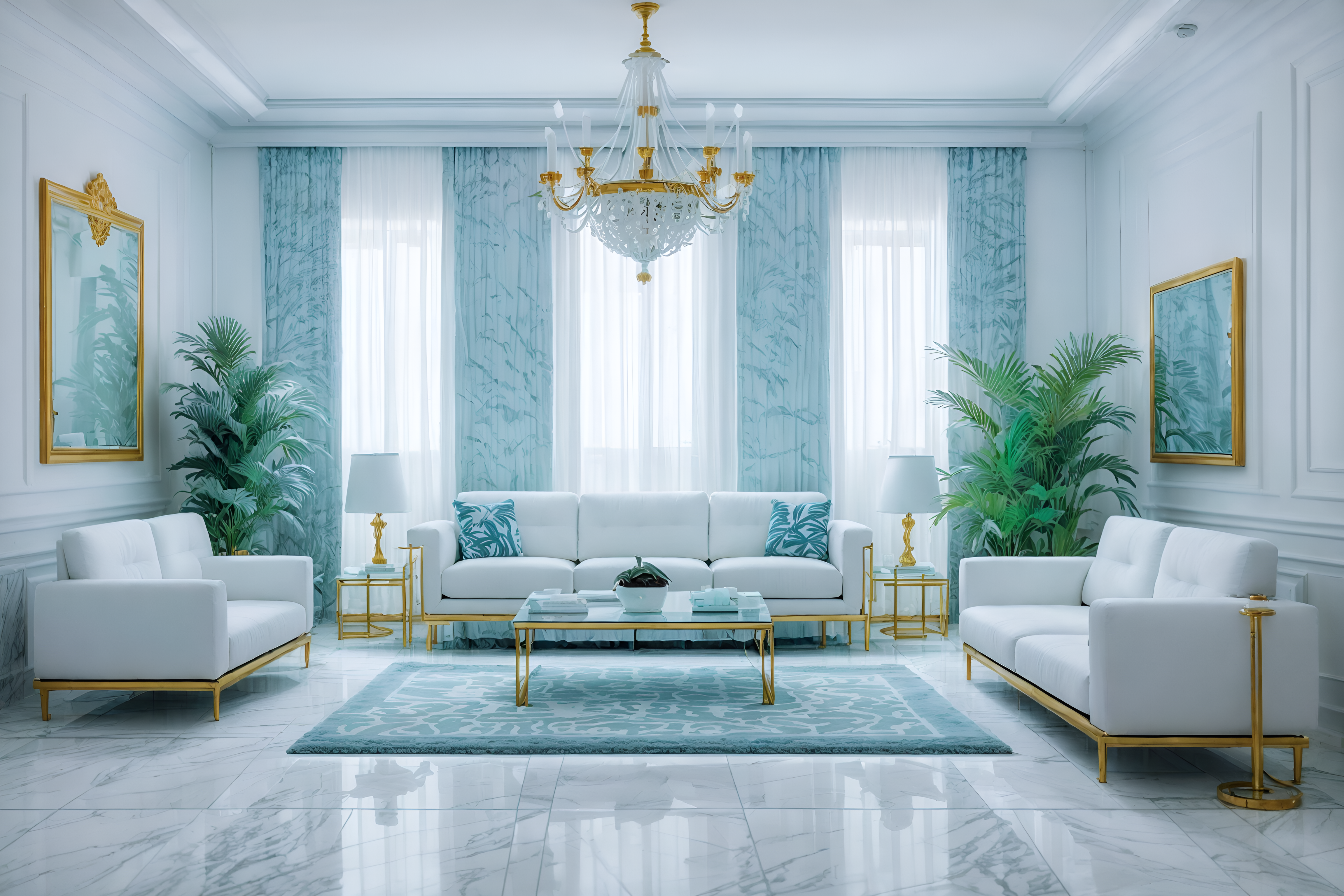 Photo from Pinterest of Vaporwave-style interior designed (living room interior) With coffee tables and sofa and televisions and plant and rug and chairs and furniture and electric lamps. . With baby blue and white square bathroom tiles and palm trees and white square bathroom tiles and white Roman statues, white Roman sculptures, white Roman columns, white Roman pillars in the center of the room, and white square bathroom tiles and white Roman statues, white Roman sculptures, white Roman columns, white Roman pillars in the center of the room, and japanese letters on wall. . Cinematic photo, highly detailed, cinematic lighting, ultra-detailed, ultrarealistic, photorealism, 8k. Trending on Pinterest. Vaporwave interior design style