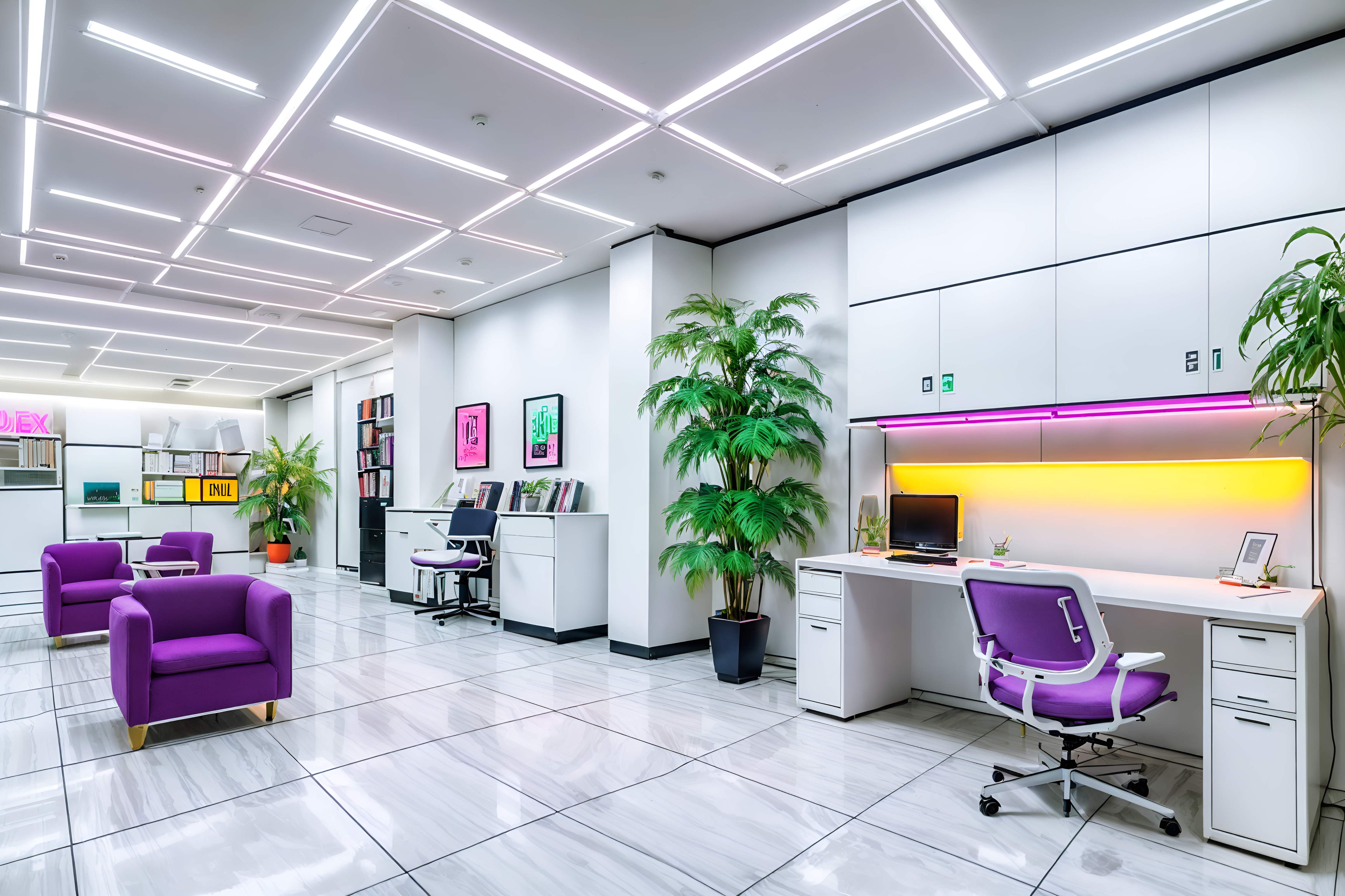 photo from pinterest of vaporwave-style interior designed (study room interior) with office chair and lounge chair and cabinets and desk lamp and plant and writing desk and bookshelves and office chair. . with 1980s retail shops and neon glow and white square bathroom tiles and neon glow and white square bathroom tiles and purple lights and white roman statues, white roman sculptures, white roman columns, white roman pillars in the center of the room, and purple lights. . cinematic photo, highly detailed, cinematic lighting, ultra-detailed, ultrarealistic, photorealism, 8k. trending on pinterest. vaporwave interior design style. masterpiece, cinematic light, ultrarealistic+, photorealistic+, 8k, raw photo, realistic, sharp focus on eyes, (symmetrical eyes), (intact eyes), hyperrealistic, highest quality, best quality, , highly detailed, masterpiece, best quality, extremely detailed 8k wallpaper, masterpiece, best quality, ultra-detailed, best shadow, detailed background, detailed face, detailed eyes, high contrast, best illumination, detailed face, dulux, caustic, dynamic angle, detailed glow. dramatic lighting. highly detailed, insanely detailed hair, symmetrical, intricate details, professionally retouched, 8k high definition. strong bokeh. award winning photo.