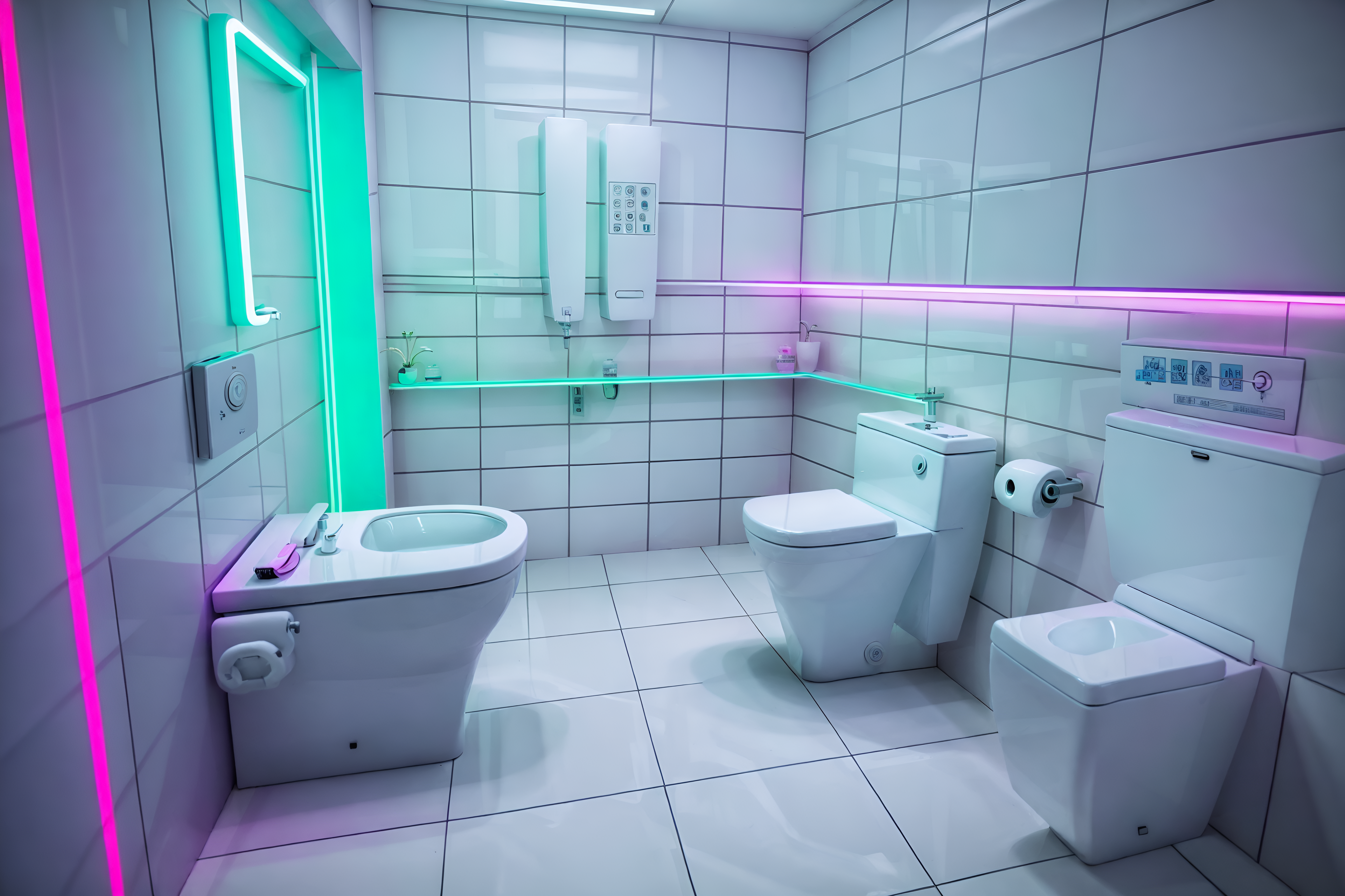 photo from pinterest of vaporwave-style interior designed (toilet interior) with sink with tap and toilet with toilet seat up and toilet paper hanger and sink with tap. . with white square bathroom tiles and neon glow and white square bathroom tiles and neon glow and palm trees and japanese letters on wall and purple lights and neon glow. . cinematic photo, highly detailed, cinematic lighting, ultra-detailed, ultrarealistic, photorealism, 8k. trending on pinterest. vaporwave interior design style. masterpiece, cinematic light, ultrarealistic+, photorealistic+, 8k, raw photo, realistic, sharp focus on eyes, (symmetrical eyes), (intact eyes), hyperrealistic, highest quality, best quality, , highly detailed, masterpiece, best quality, extremely detailed 8k wallpaper, masterpiece, best quality, ultra-detailed, best shadow, detailed background, detailed face, detailed eyes, high contrast, best illumination, detailed face, dulux, caustic, dynamic angle, detailed glow. dramatic lighting. highly detailed, insanely detailed hair, symmetrical, intricate details, professionally retouched, 8k high definition. strong bokeh. award winning photo.