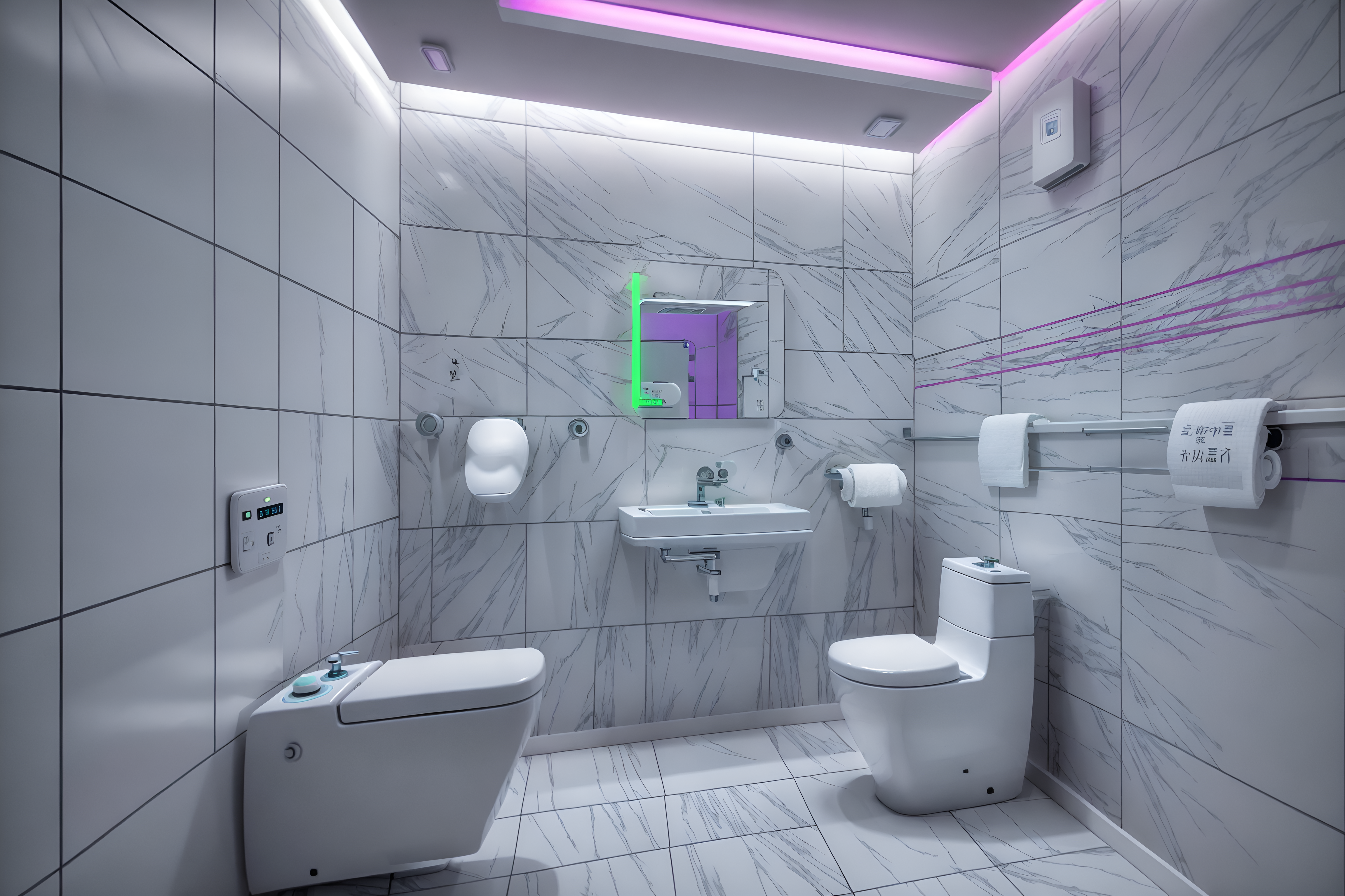 photo from pinterest of vaporwave-style interior designed (toilet interior) with sink with tap and toilet with toilet seat up and toilet paper hanger and sink with tap. . with white square bathroom tiles and neon glow and white square bathroom tiles and neon glow and palm trees and japanese letters on wall and purple lights and neon glow. . cinematic photo, highly detailed, cinematic lighting, ultra-detailed, ultrarealistic, photorealism, 8k. trending on pinterest. vaporwave interior design style. masterpiece, cinematic light, ultrarealistic+, photorealistic+, 8k, raw photo, realistic, sharp focus on eyes, (symmetrical eyes), (intact eyes), hyperrealistic, highest quality, best quality, , highly detailed, masterpiece, best quality, extremely detailed 8k wallpaper, masterpiece, best quality, ultra-detailed, best shadow, detailed background, detailed face, detailed eyes, high contrast, best illumination, detailed face, dulux, caustic, dynamic angle, detailed glow. dramatic lighting. highly detailed, insanely detailed hair, symmetrical, intricate details, professionally retouched, 8k high definition. strong bokeh. award winning photo.