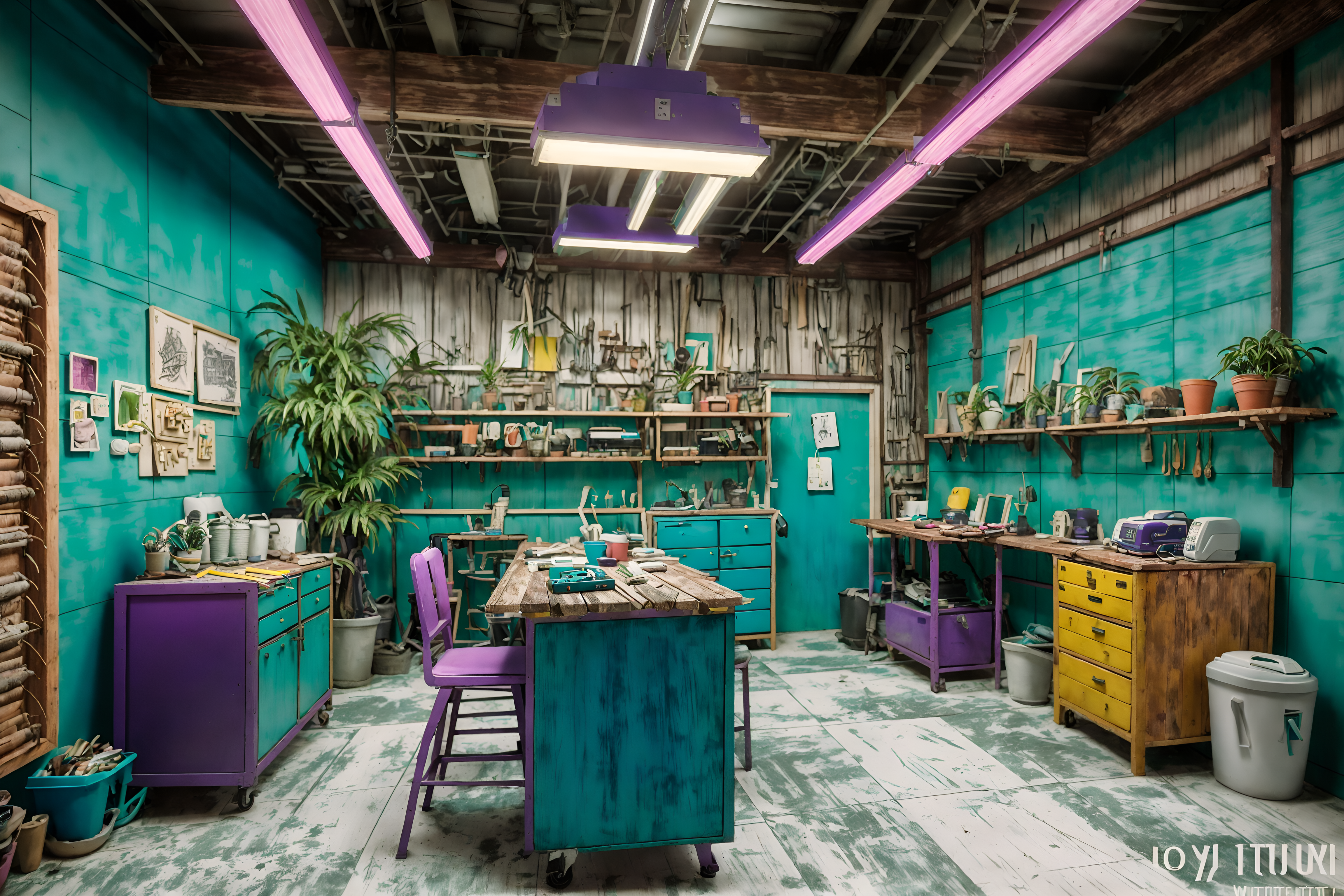 photo from pinterest of vaporwave-style interior designed (workshop interior) with messy and wooden workbench and tool wall and messy. . with teal colors and purple lights and white square bathroom tiles and hanging plants and palm trees and white square bathroom tiles and palm trees and bright pink. . cinematic photo, highly detailed, cinematic lighting, ultra-detailed, ultrarealistic, photorealism, 8k. trending on pinterest. vaporwave interior design style. masterpiece, cinematic light, ultrarealistic+, photorealistic+, 8k, raw photo, realistic, sharp focus on eyes, (symmetrical eyes), (intact eyes), hyperrealistic, highest quality, best quality, , highly detailed, masterpiece, best quality, extremely detailed 8k wallpaper, masterpiece, best quality, ultra-detailed, best shadow, detailed background, detailed face, detailed eyes, high contrast, best illumination, detailed face, dulux, caustic, dynamic angle, detailed glow. dramatic lighting. highly detailed, insanely detailed hair, symmetrical, intricate details, professionally retouched, 8k high definition. strong bokeh. award winning photo.