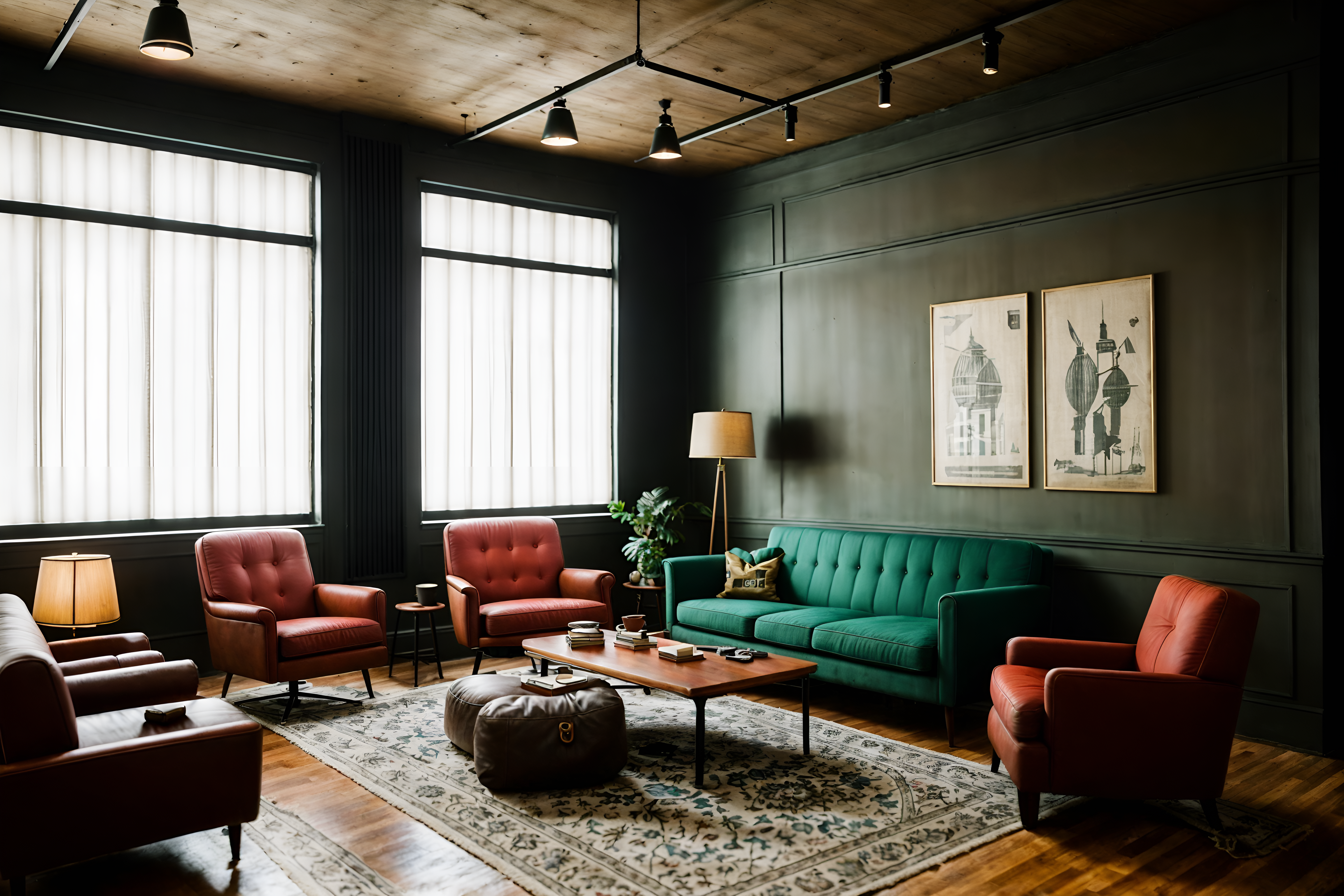 photo from pinterest of vintage-style interior designed (coworking space interior) with seating area with sofa and lounge chairs and office chairs and office desks and seating area with sofa. . with . . cinematic photo, highly detailed, cinematic lighting, ultra-detailed, ultrarealistic, photorealism, 8k. trending on pinterest. vintage interior design style. masterpiece, cinematic light, ultrarealistic+, photorealistic+, 8k, raw photo, realistic, sharp focus on eyes, (symmetrical eyes), (intact eyes), hyperrealistic, highest quality, best quality, , highly detailed, masterpiece, best quality, extremely detailed 8k wallpaper, masterpiece, best quality, ultra-detailed, best shadow, detailed background, detailed face, detailed eyes, high contrast, best illumination, detailed face, dulux, caustic, dynamic angle, detailed glow. dramatic lighting. highly detailed, insanely detailed hair, symmetrical, intricate details, professionally retouched, 8k high definition. strong bokeh. award winning photo.
