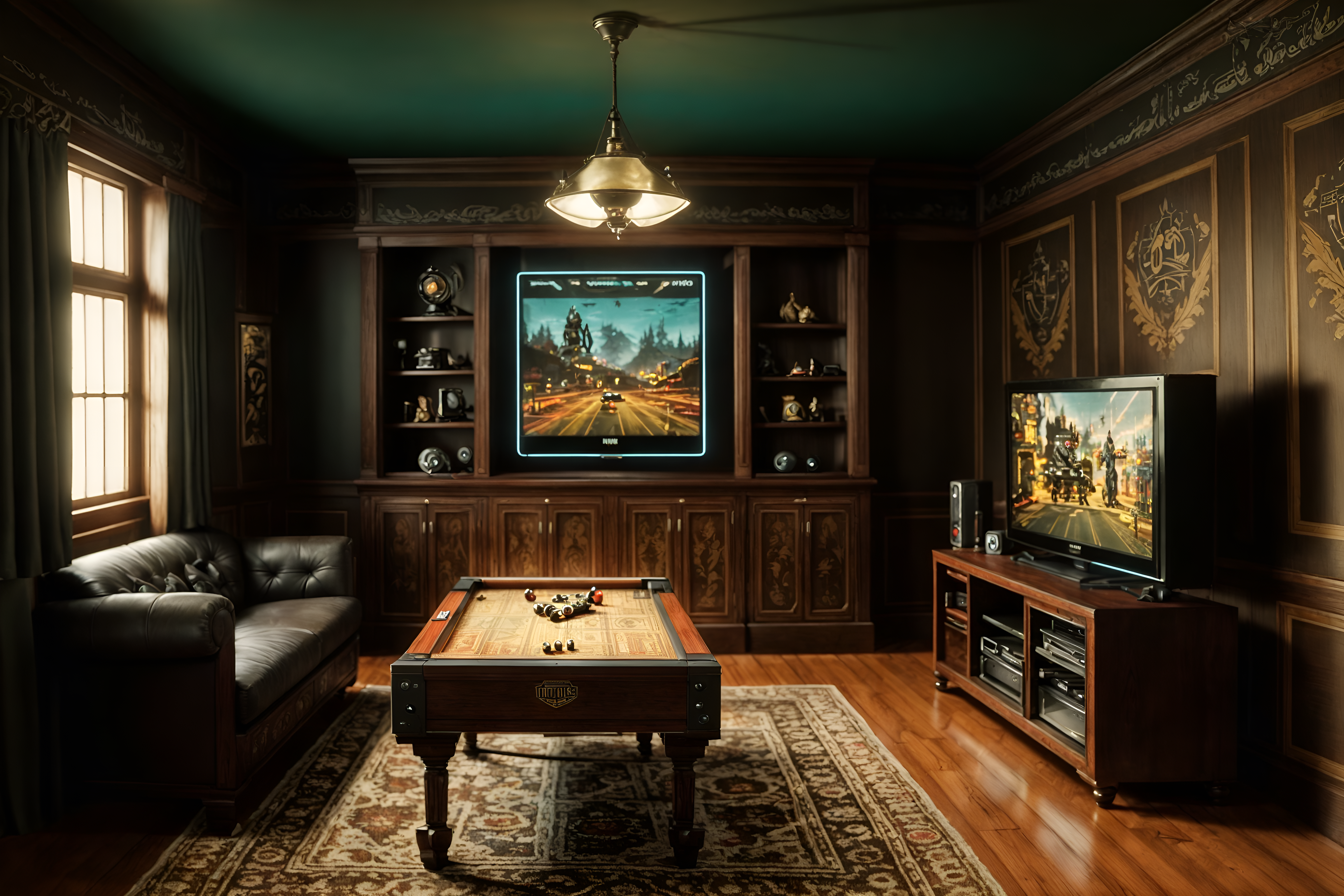 photo from pinterest of vintage-style interior designed (gaming room interior) . with . . cinematic photo, highly detailed, cinematic lighting, ultra-detailed, ultrarealistic, photorealism, 8k. trending on pinterest. vintage interior design style. masterpiece, cinematic light, ultrarealistic+, photorealistic+, 8k, raw photo, realistic, sharp focus on eyes, (symmetrical eyes), (intact eyes), hyperrealistic, highest quality, best quality, , highly detailed, masterpiece, best quality, extremely detailed 8k wallpaper, masterpiece, best quality, ultra-detailed, best shadow, detailed background, detailed face, detailed eyes, high contrast, best illumination, detailed face, dulux, caustic, dynamic angle, detailed glow. dramatic lighting. highly detailed, insanely detailed hair, symmetrical, intricate details, professionally retouched, 8k high definition. strong bokeh. award winning photo.