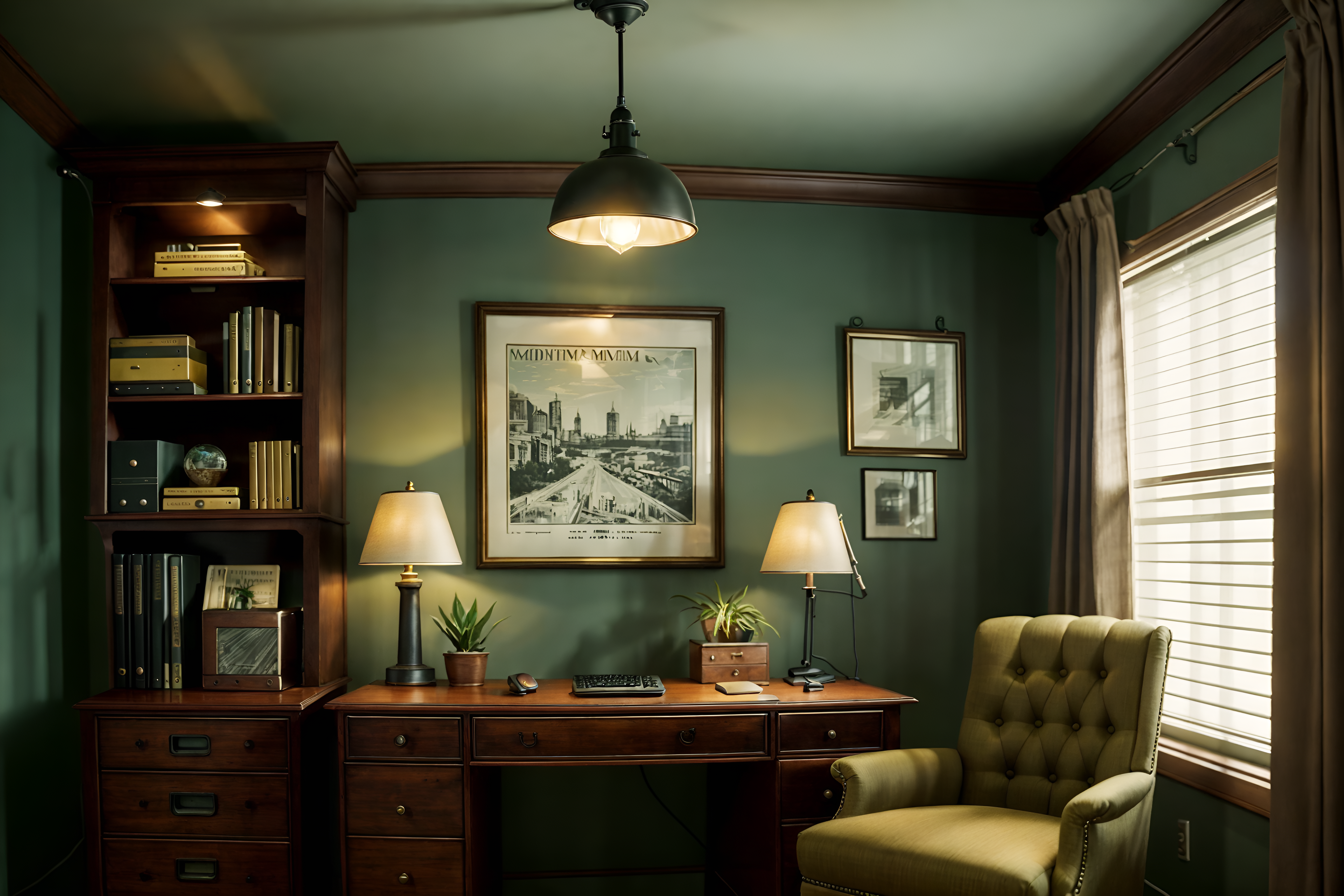 photo from pinterest of vintage-style interior designed (home office interior) with cabinets and computer desk and office chair and plant and desk lamp and cabinets. . with . . cinematic photo, highly detailed, cinematic lighting, ultra-detailed, ultrarealistic, photorealism, 8k. trending on pinterest. vintage interior design style. masterpiece, cinematic light, ultrarealistic+, photorealistic+, 8k, raw photo, realistic, sharp focus on eyes, (symmetrical eyes), (intact eyes), hyperrealistic, highest quality, best quality, , highly detailed, masterpiece, best quality, extremely detailed 8k wallpaper, masterpiece, best quality, ultra-detailed, best shadow, detailed background, detailed face, detailed eyes, high contrast, best illumination, detailed face, dulux, caustic, dynamic angle, detailed glow. dramatic lighting. highly detailed, insanely detailed hair, symmetrical, intricate details, professionally retouched, 8k high definition. strong bokeh. award winning photo.