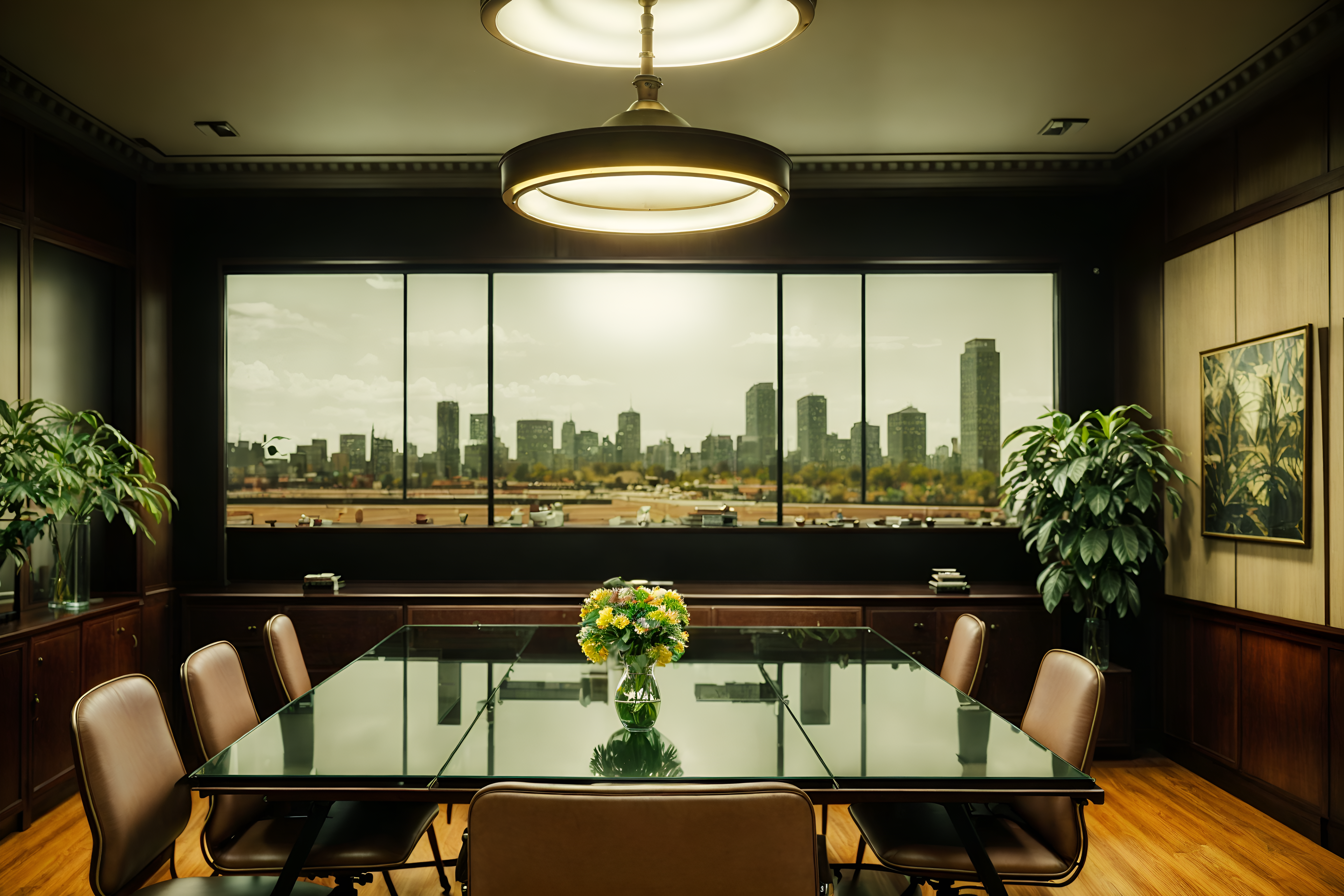 photo from pinterest of vintage-style interior designed (meeting room interior) with boardroom table and vase and painting or photo on wall and glass doors and cabinets and office chairs and glass walls and plant. . with . . cinematic photo, highly detailed, cinematic lighting, ultra-detailed, ultrarealistic, photorealism, 8k. trending on pinterest. vintage interior design style. masterpiece, cinematic light, ultrarealistic+, photorealistic+, 8k, raw photo, realistic, sharp focus on eyes, (symmetrical eyes), (intact eyes), hyperrealistic, highest quality, best quality, , highly detailed, masterpiece, best quality, extremely detailed 8k wallpaper, masterpiece, best quality, ultra-detailed, best shadow, detailed background, detailed face, detailed eyes, high contrast, best illumination, detailed face, dulux, caustic, dynamic angle, detailed glow. dramatic lighting. highly detailed, insanely detailed hair, symmetrical, intricate details, professionally retouched, 8k high definition. strong bokeh. award winning photo.