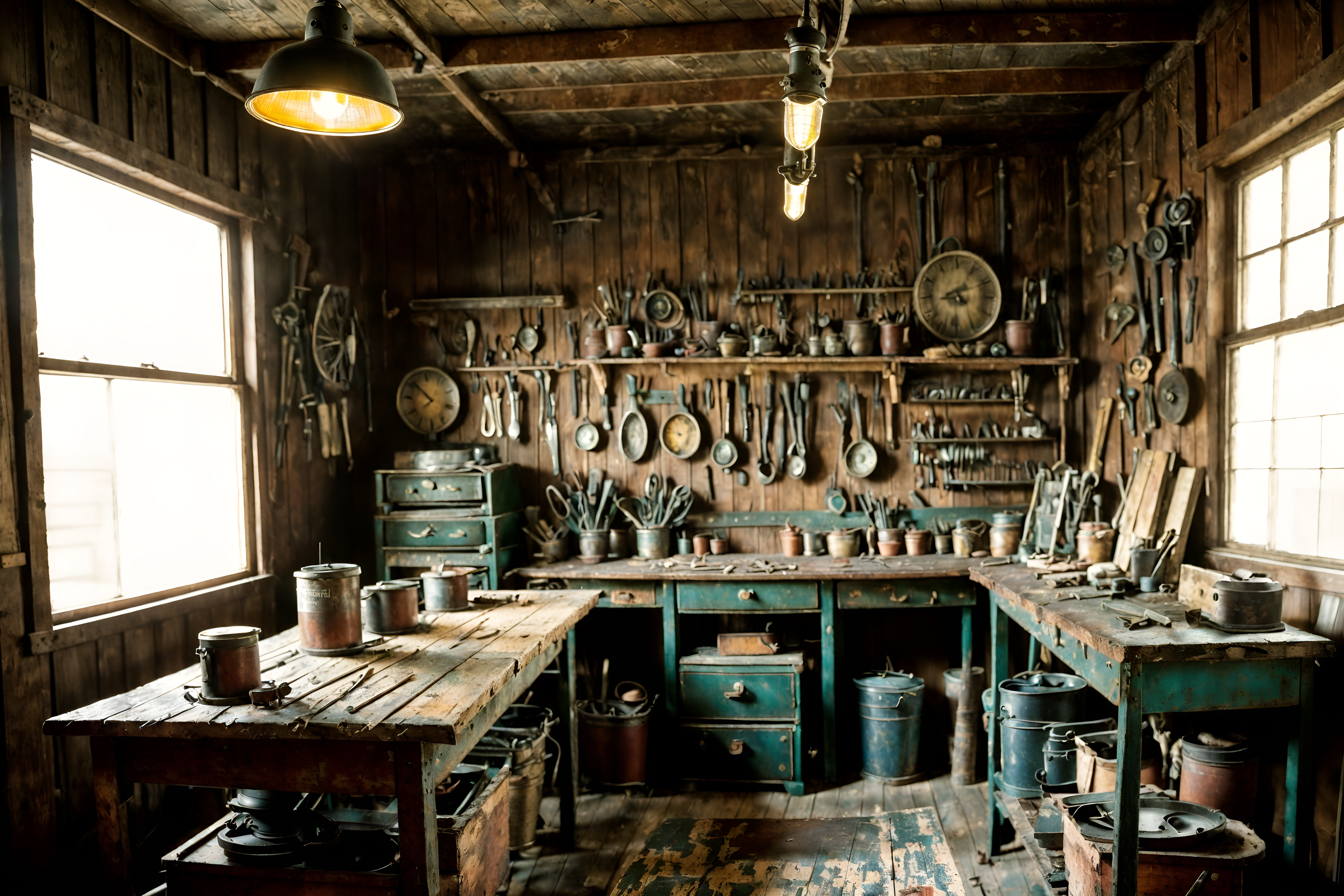 photo from pinterest of vintage-style interior designed (workshop interior) with messy and wooden workbench and tool wall and messy. . with . . cinematic photo, highly detailed, cinematic lighting, ultra-detailed, ultrarealistic, photorealism, 8k. trending on pinterest. vintage interior design style. masterpiece, cinematic light, ultrarealistic+, photorealistic+, 8k, raw photo, realistic, sharp focus on eyes, (symmetrical eyes), (intact eyes), hyperrealistic, highest quality, best quality, , highly detailed, masterpiece, best quality, extremely detailed 8k wallpaper, masterpiece, best quality, ultra-detailed, best shadow, detailed background, detailed face, detailed eyes, high contrast, best illumination, detailed face, dulux, caustic, dynamic angle, detailed glow. dramatic lighting. highly detailed, insanely detailed hair, symmetrical, intricate details, professionally retouched, 8k high definition. strong bokeh. award winning photo.