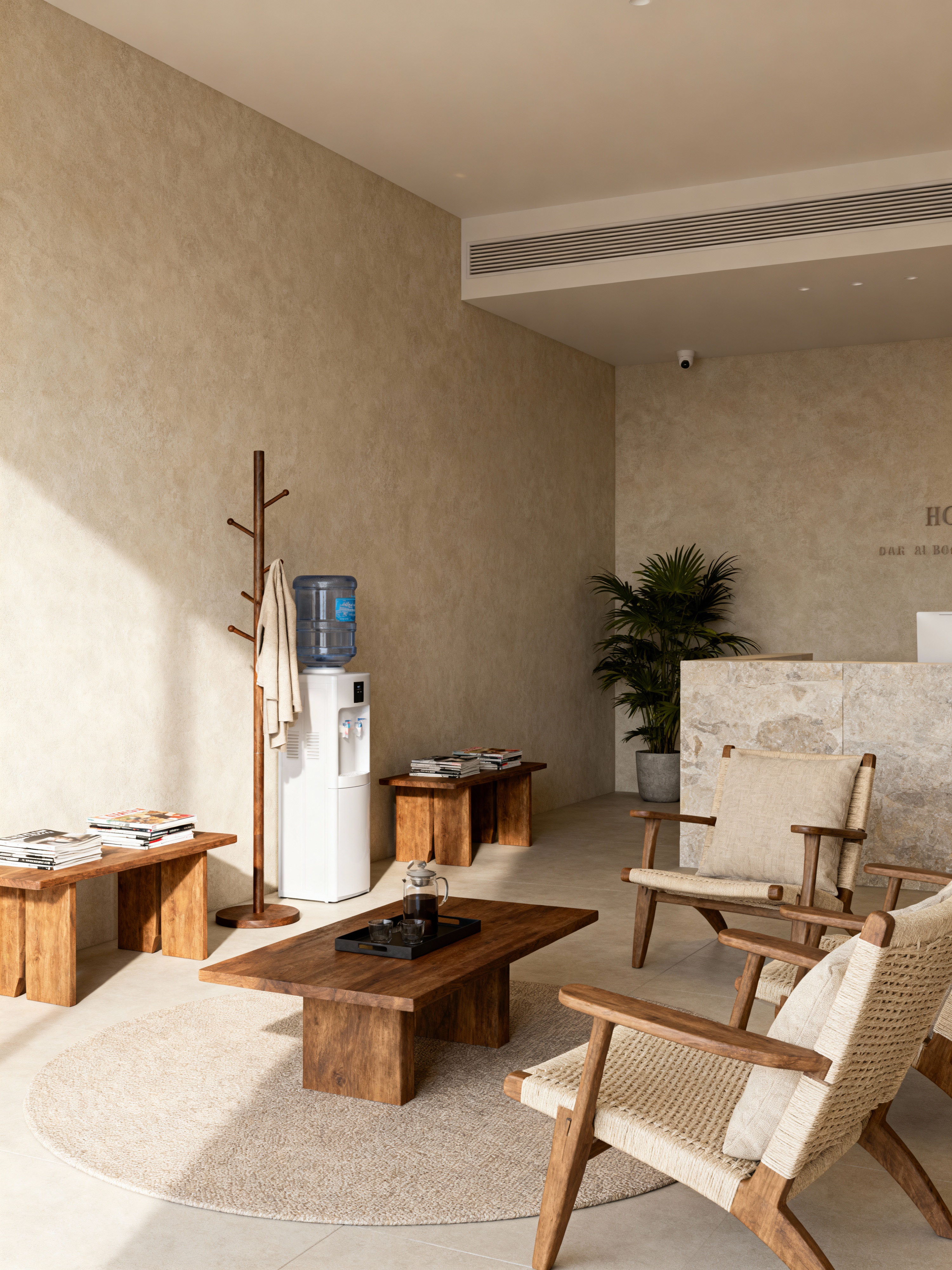 waiting room with airbnb style with side tables and magazines and coat rack and coffee table and water cooler and chairs and plants and reception desk. . with simple, clean lines and simplistic furniture and neutral walls and textures and scandinavian style and open and natural lighting and natural materials and elements and practicality and functionality and simple color palette and simple, clean lines and simplistic furniture