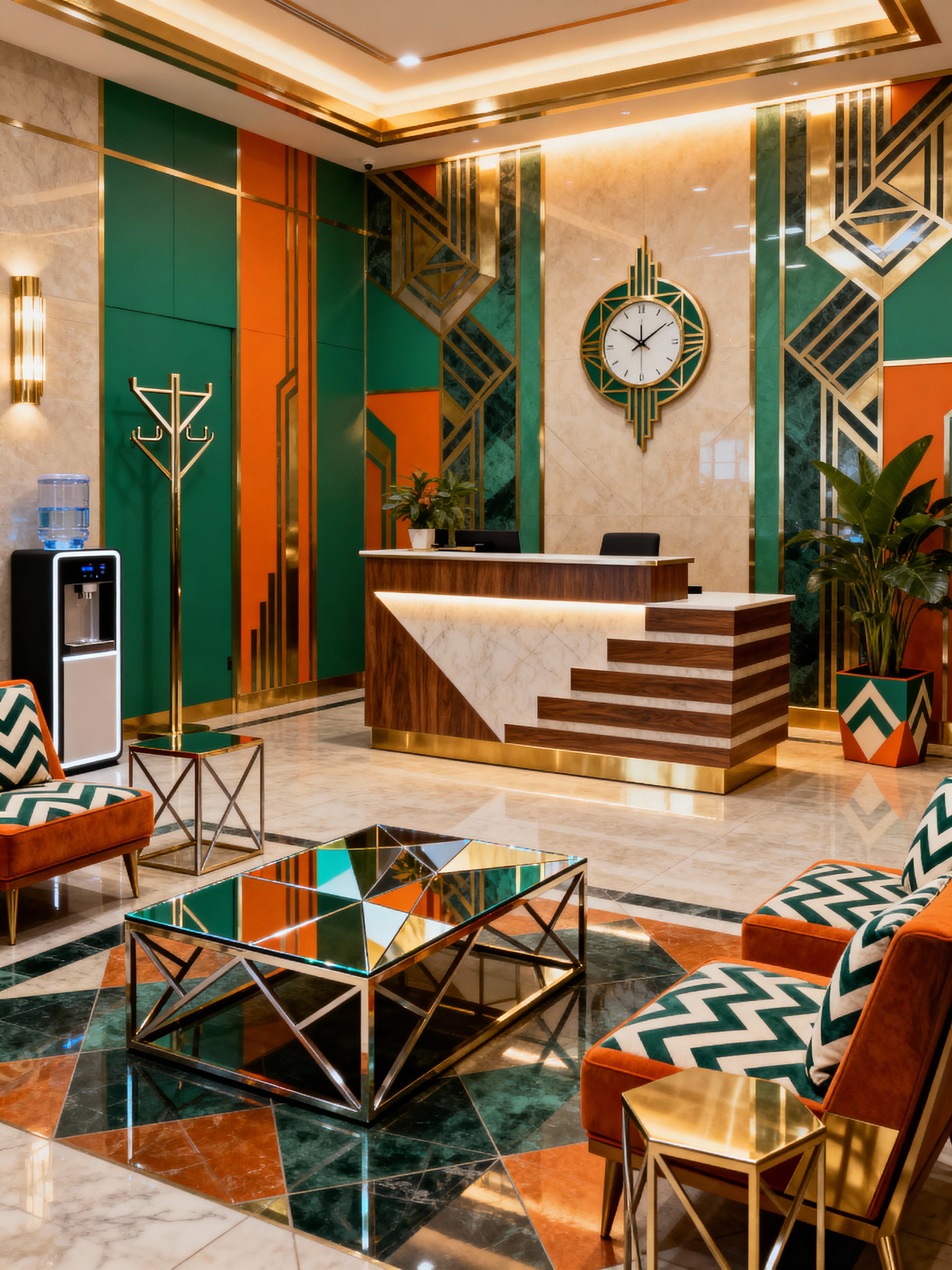 waiting room with art deco style with side tables and chairs and coat rack and reception desk and clock and water cooler and coffee table and plants. . with geometric lines and bold geometry and geometric shapes and decadent detail and luxury and angular shapes and bright and cheerful colors and exuberant shapes