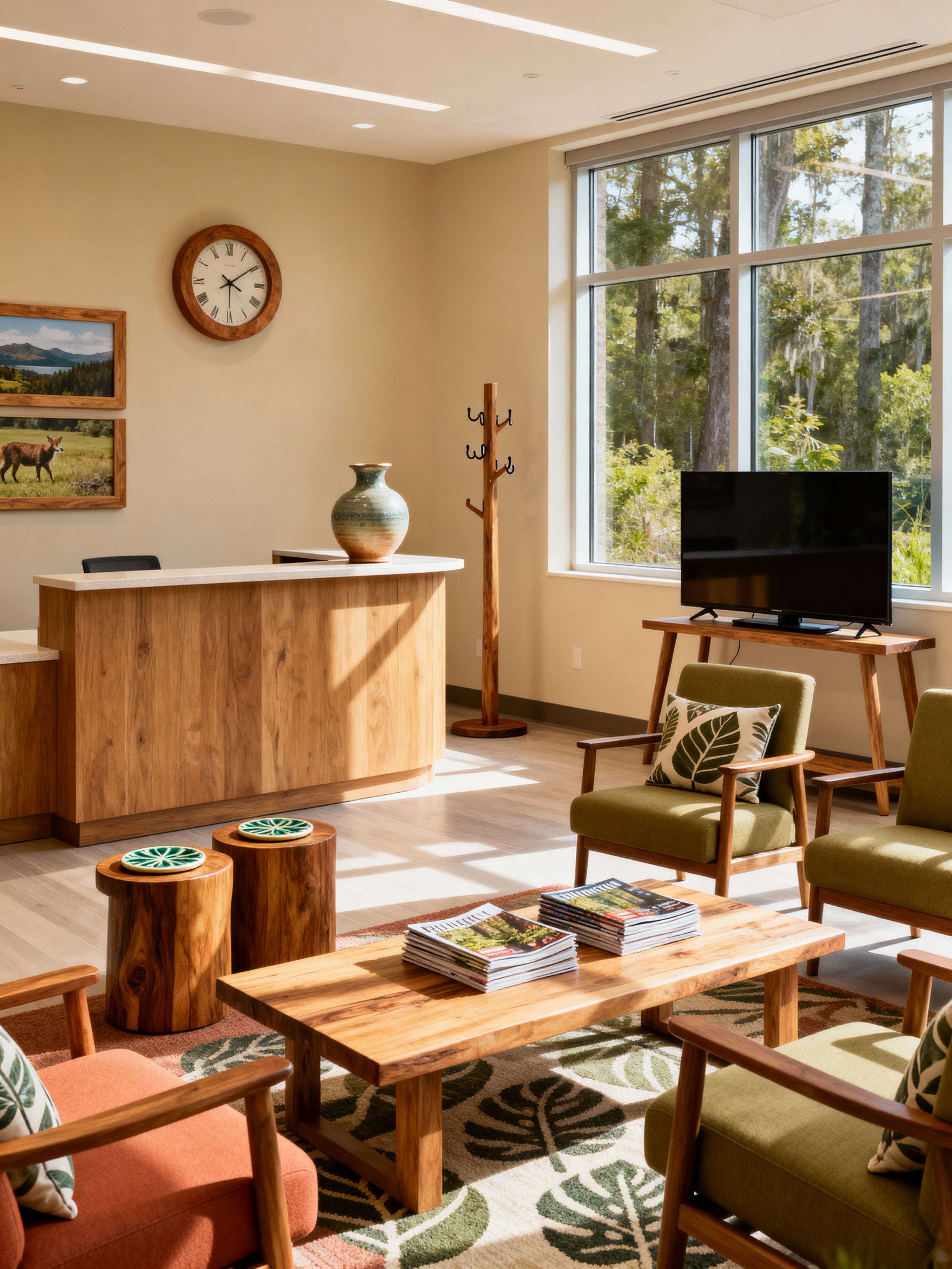 waiting room with biophilic style with clock and side tables and reception desk and coffee table and coat rack and chairs and television and magazines. . with wood materials and images of animals and ceramic materials and images of nature and natural patterns and earthy colors and sunlight and environmental features