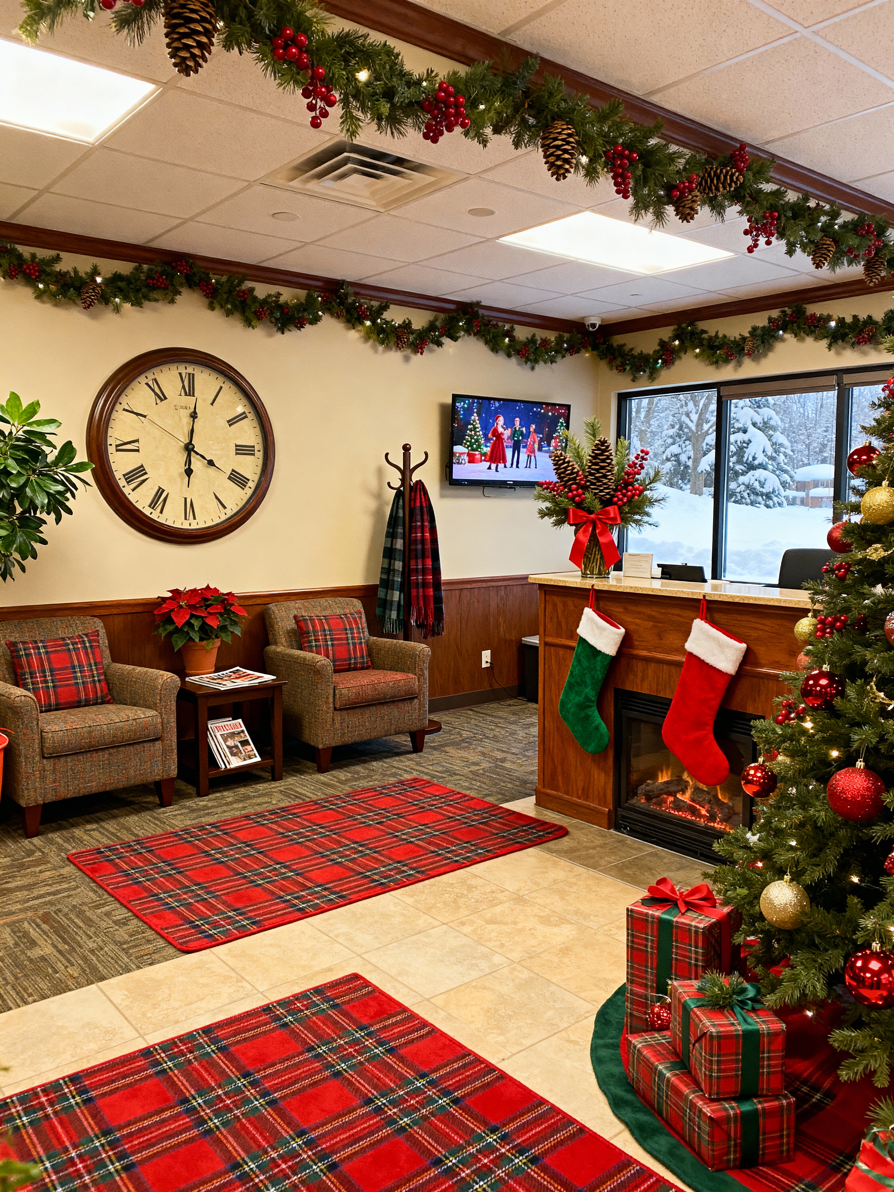 waiting room with christmas style with clock and plants and chairs and magazines and side tables and coat rack and television and reception desk. . with berries and greenery draped and tie pinecones and berries and a few big socks hanging and snow outside and plaid rugs and giftwrapped gifts and christmas ornaments and ribbons