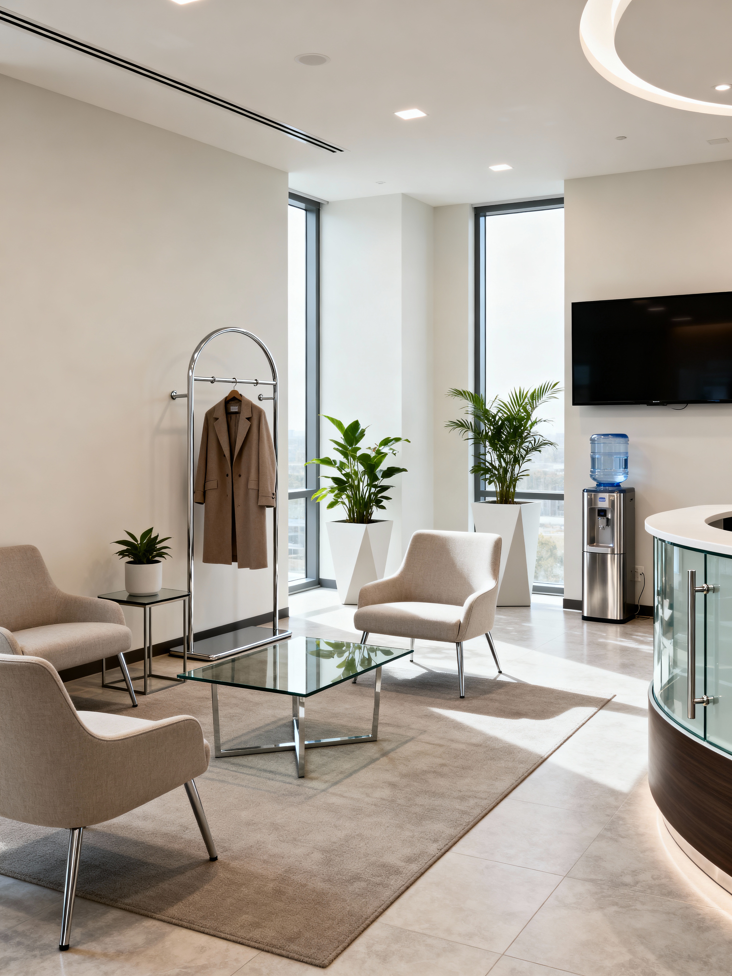 waiting room with contemporary style with coat rack and plants and side tables and chairs and television and reception desk and coffee table and water cooler. . with neutral palette and minimalist and clean look and glass decor and modern finishes and elegant simplicity and open spaces and functional design