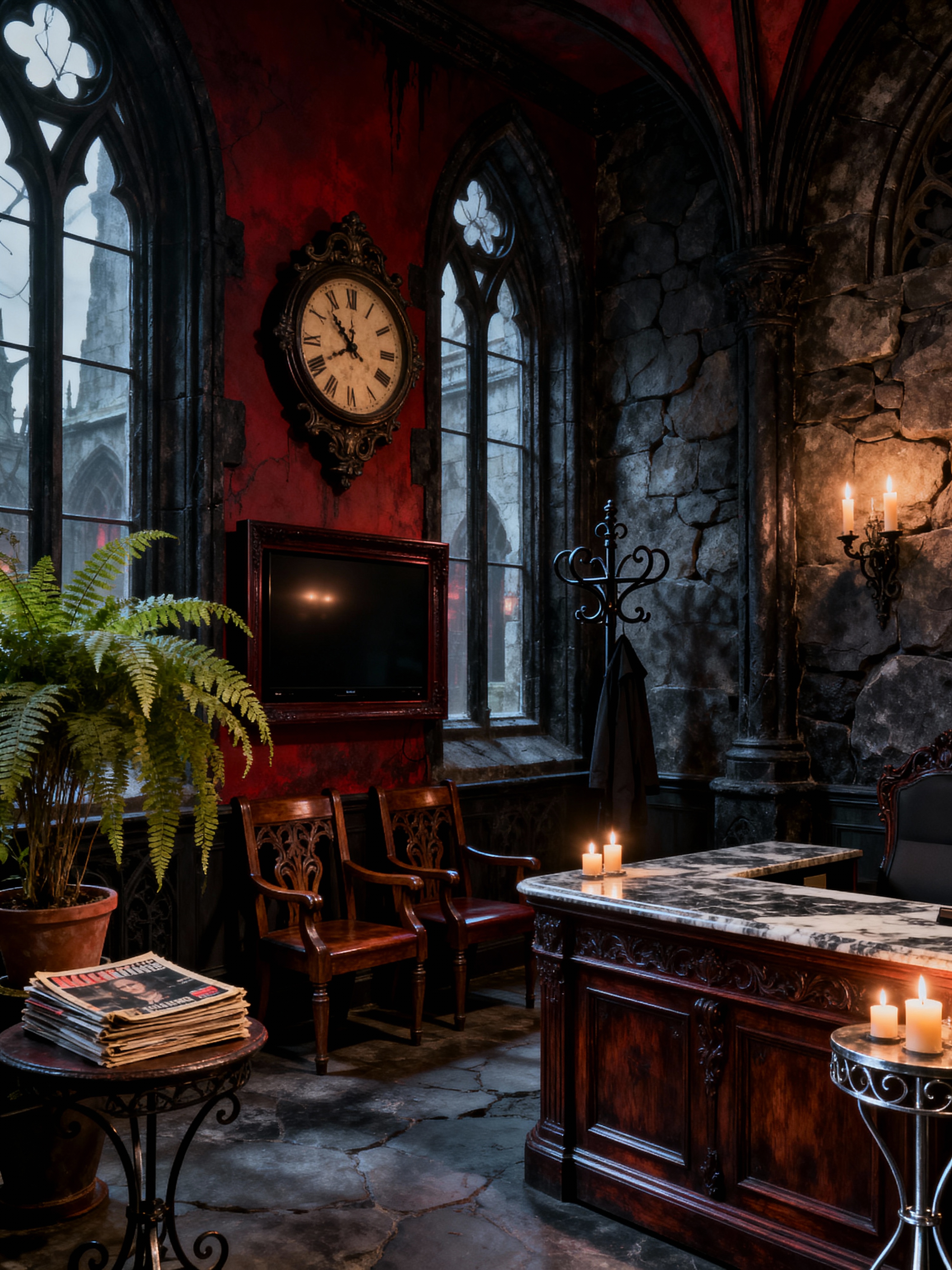 waiting room with gothic style with clock and chairs and coat rack and television and plants and magazines and reception desk and side tables. . with medieval influence and dark colors and arched windows and cathedral style and mysterious mood and candlelit ambiance and stone textures and heavy furniture