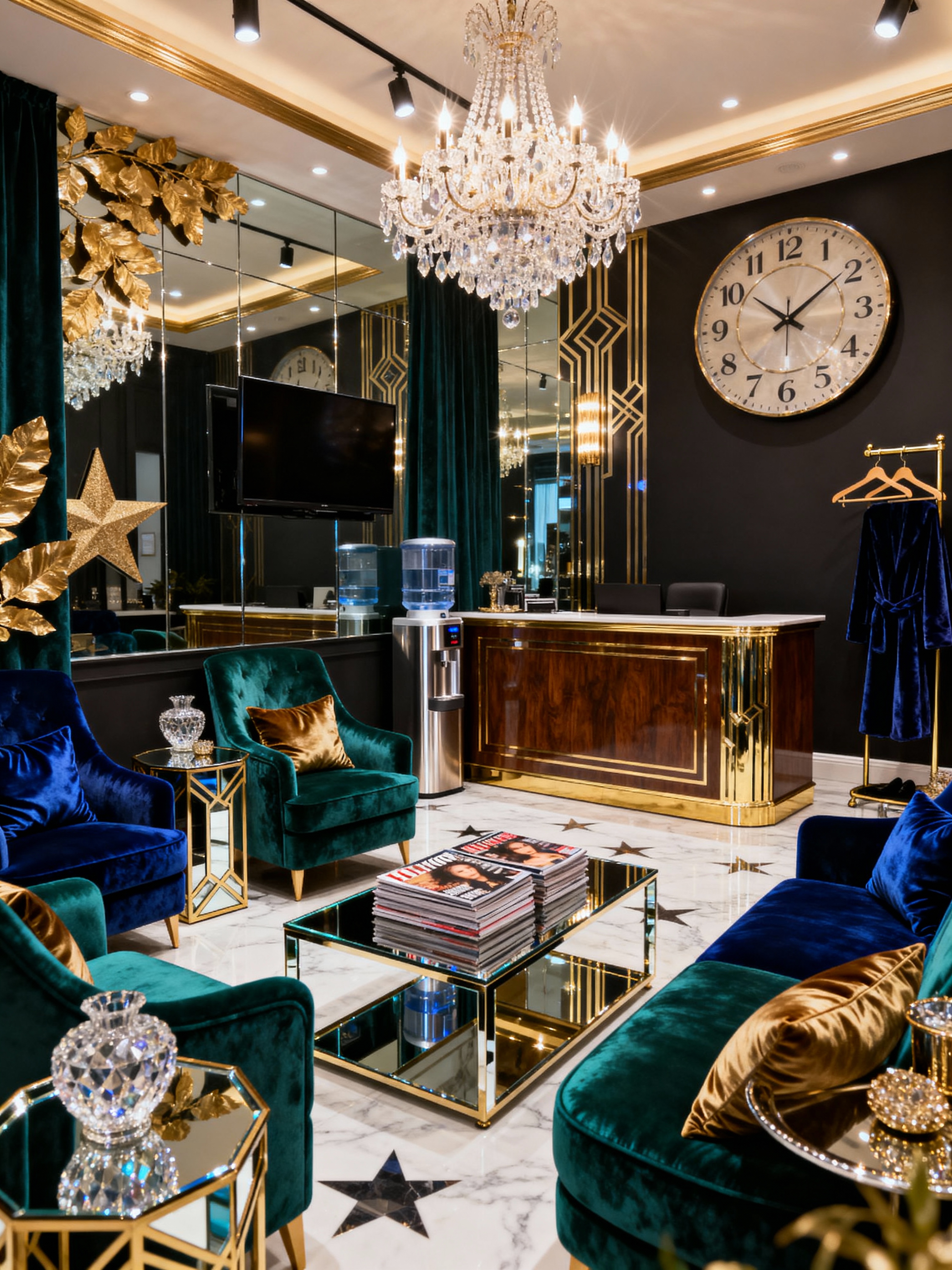 waiting room with hollywood glam style with side tables and water cooler and reception desk and magazines and television and chairs and clock and coat rack. . with star quality and crystal chandeliers and opulent details and dramatic lighting and velvet upholstery and glamorous style and luxurious fabrics and art deco influence