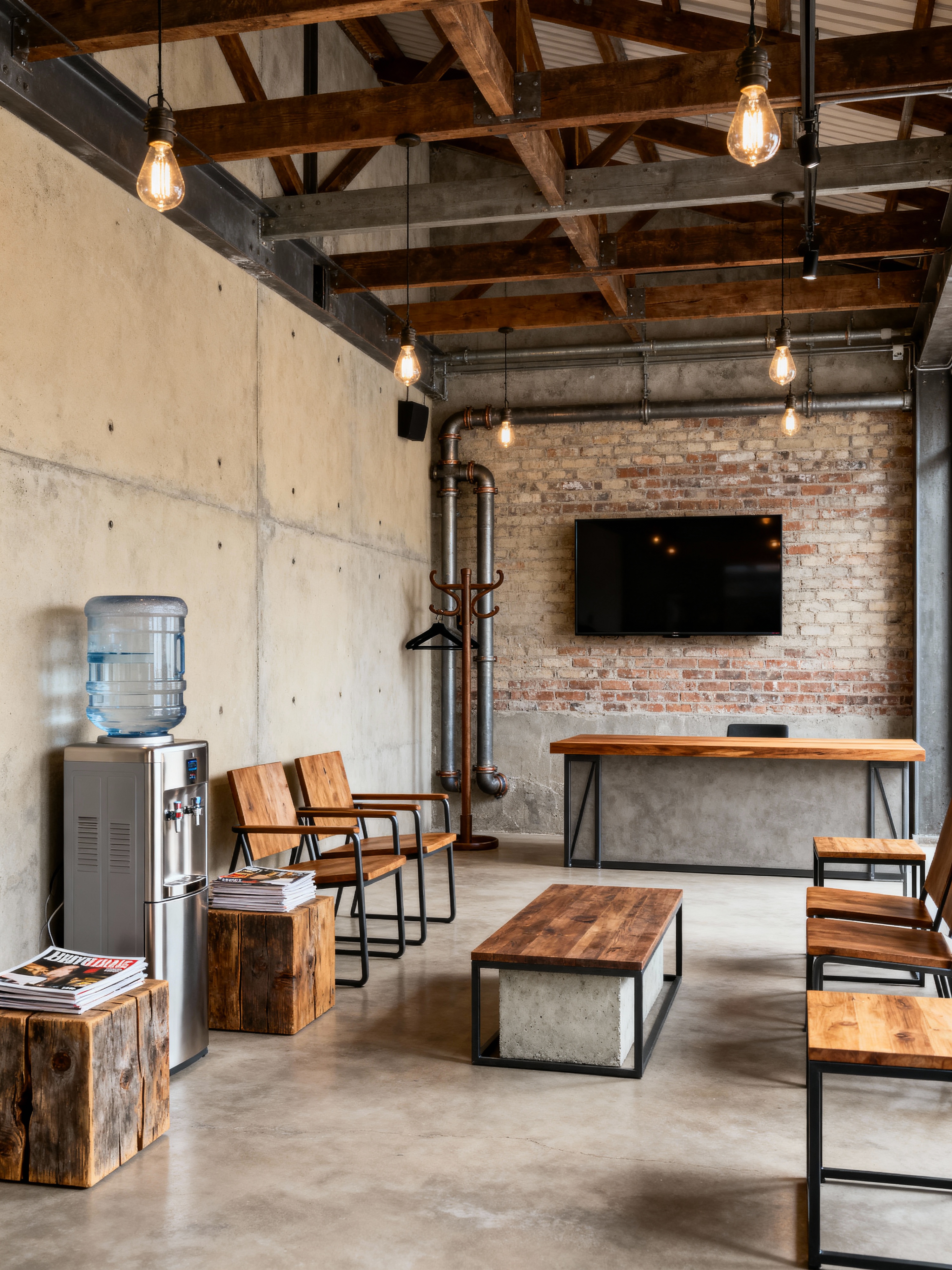 waiting room with industrial style with water cooler and chairs and television and coat rack and magazines and coffee table and reception desk and side tables. . with neutral tones and exposed rafters and factory style and raw aesthetic and open floorplan and utilitarian objects and exposed concrete and reclaimed wood