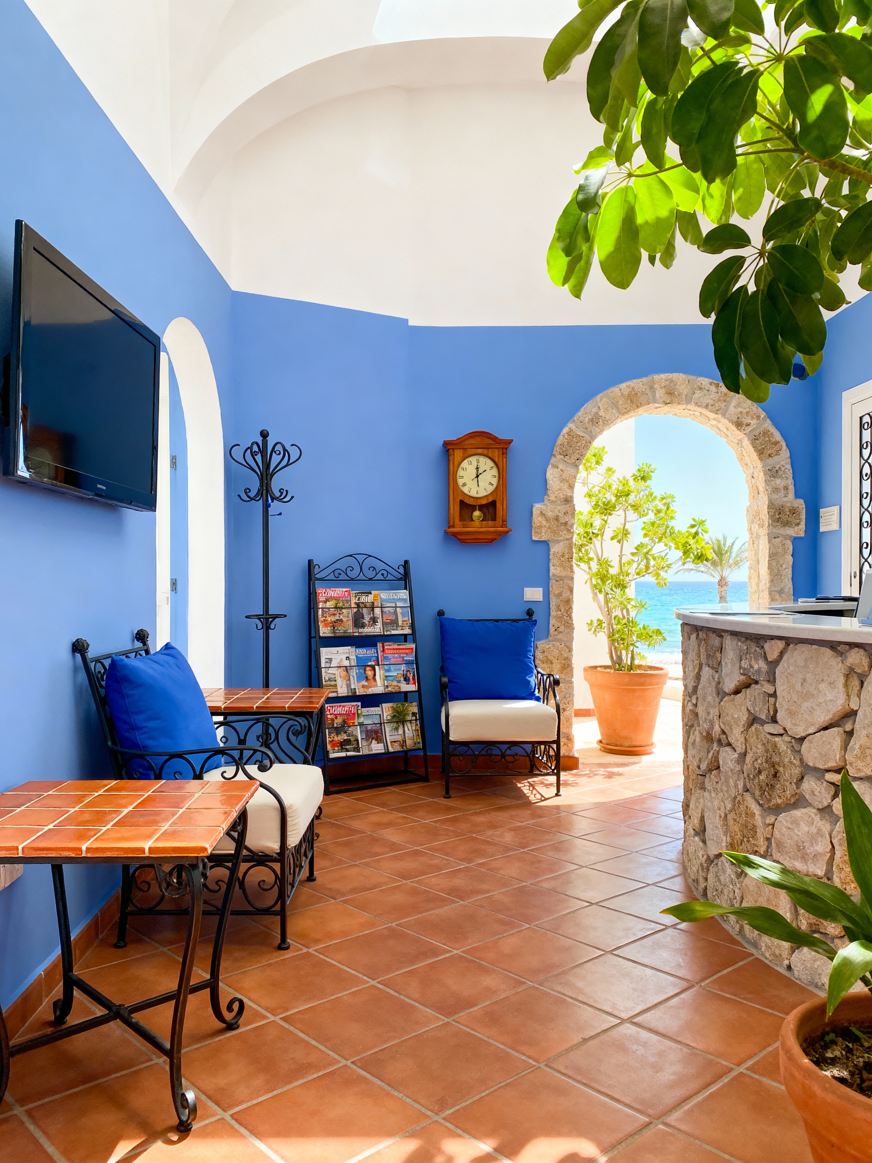 waiting room with mediterranean style with side tables and television and chairs and magazines and coat rack and clock and reception desk and plants. . with blue and white and outdoor living and sun-drenched and arched doorways and terracotta tiles and coastal influence and stone accents and wrought iron