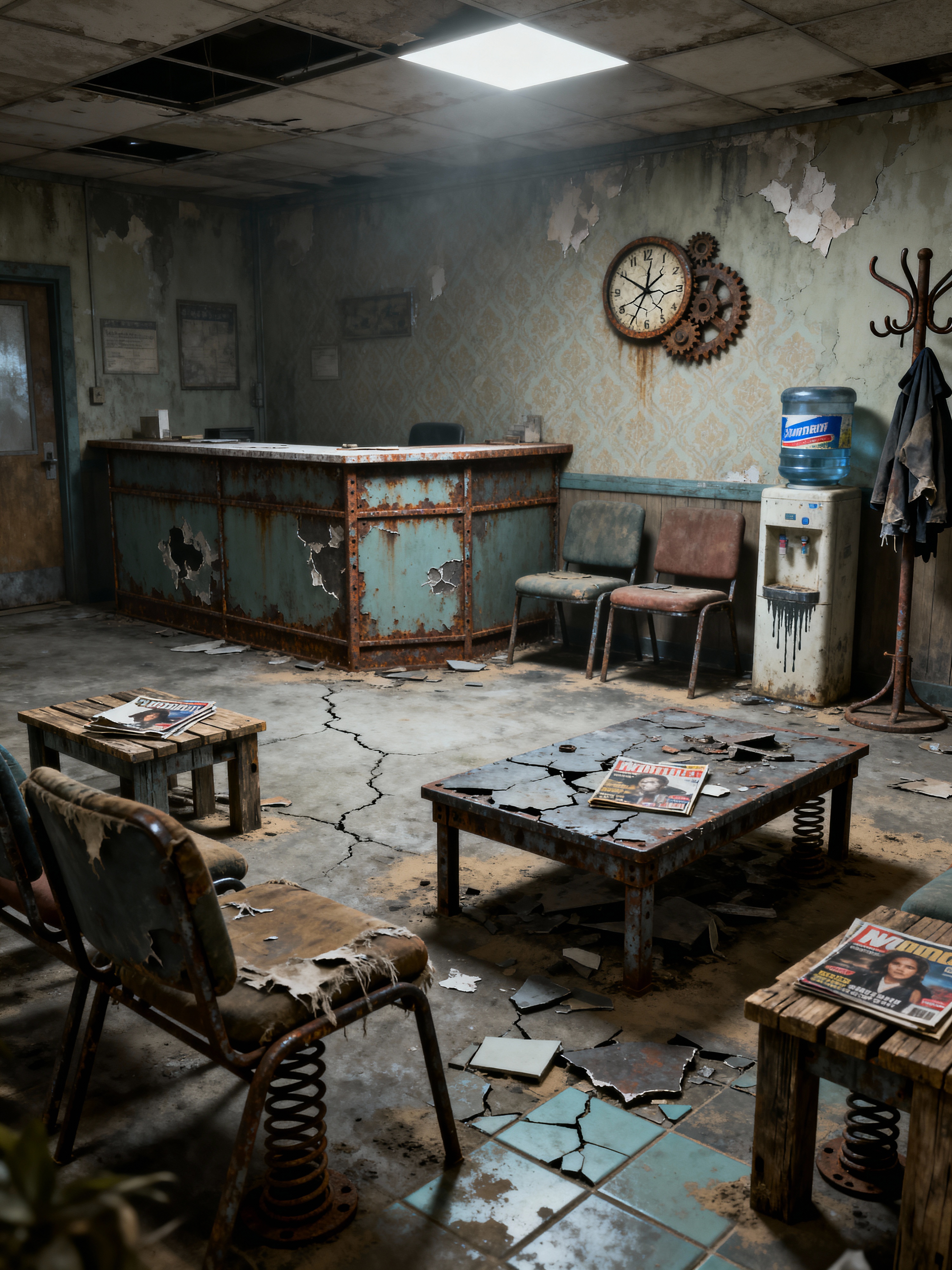 waiting room with post-apocalyptic style with clock and magazines and chairs and side tables and reception desk and coffee table and water cooler and coat rack. . with post-apocalyptic and scavenged decor and desolate and weathered materials and gritty atmosphere and distressed furniture and urbex and broken tiles