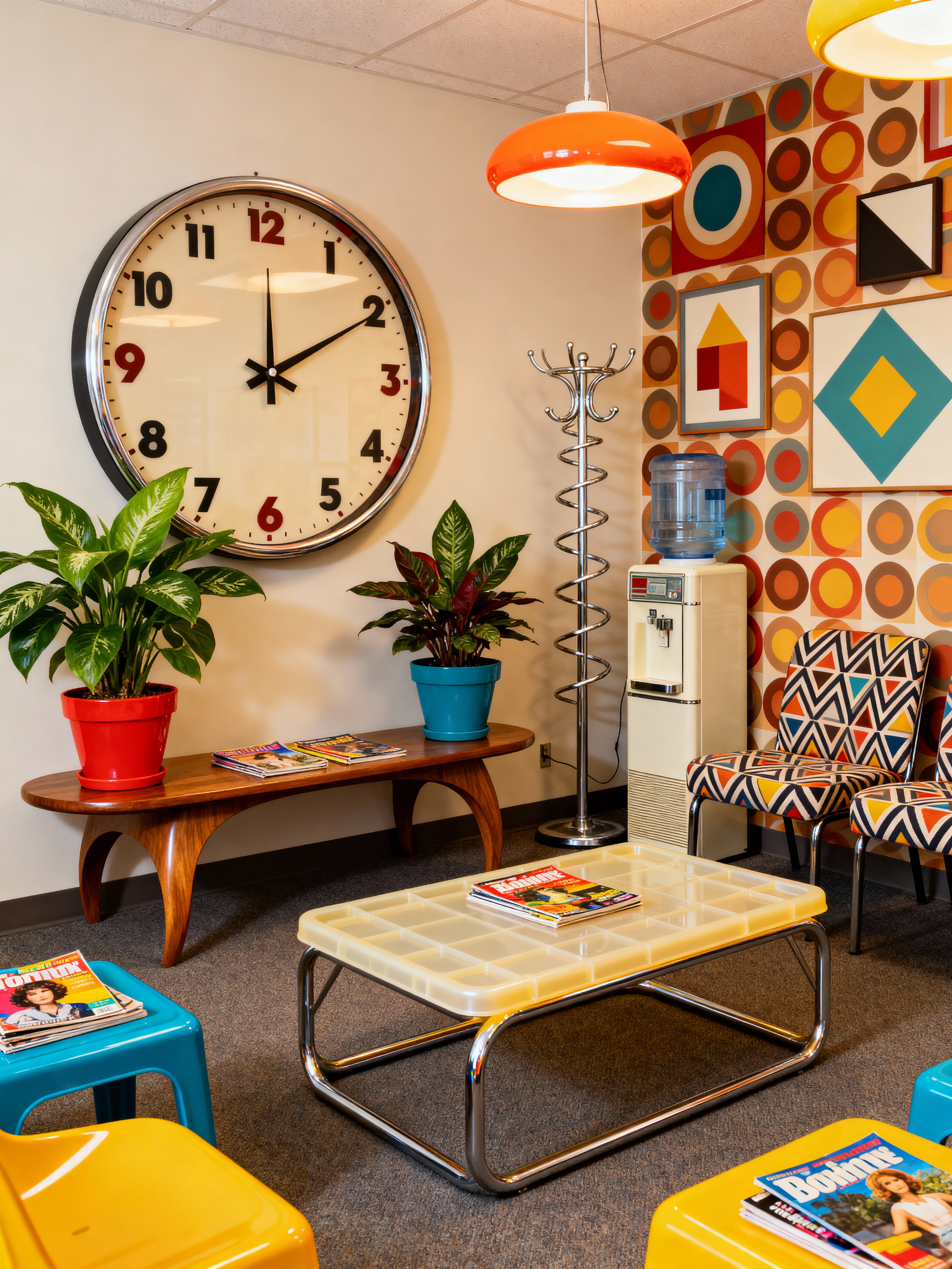 waiting room with retro style with clock and plants and side tables and magazines and coffee table and chairs and water cooler and coat rack. . with bright colors and nostalgic pieces and mod style and plastic furniture and groovy vibes and bold patterns and geometric shapes and space age