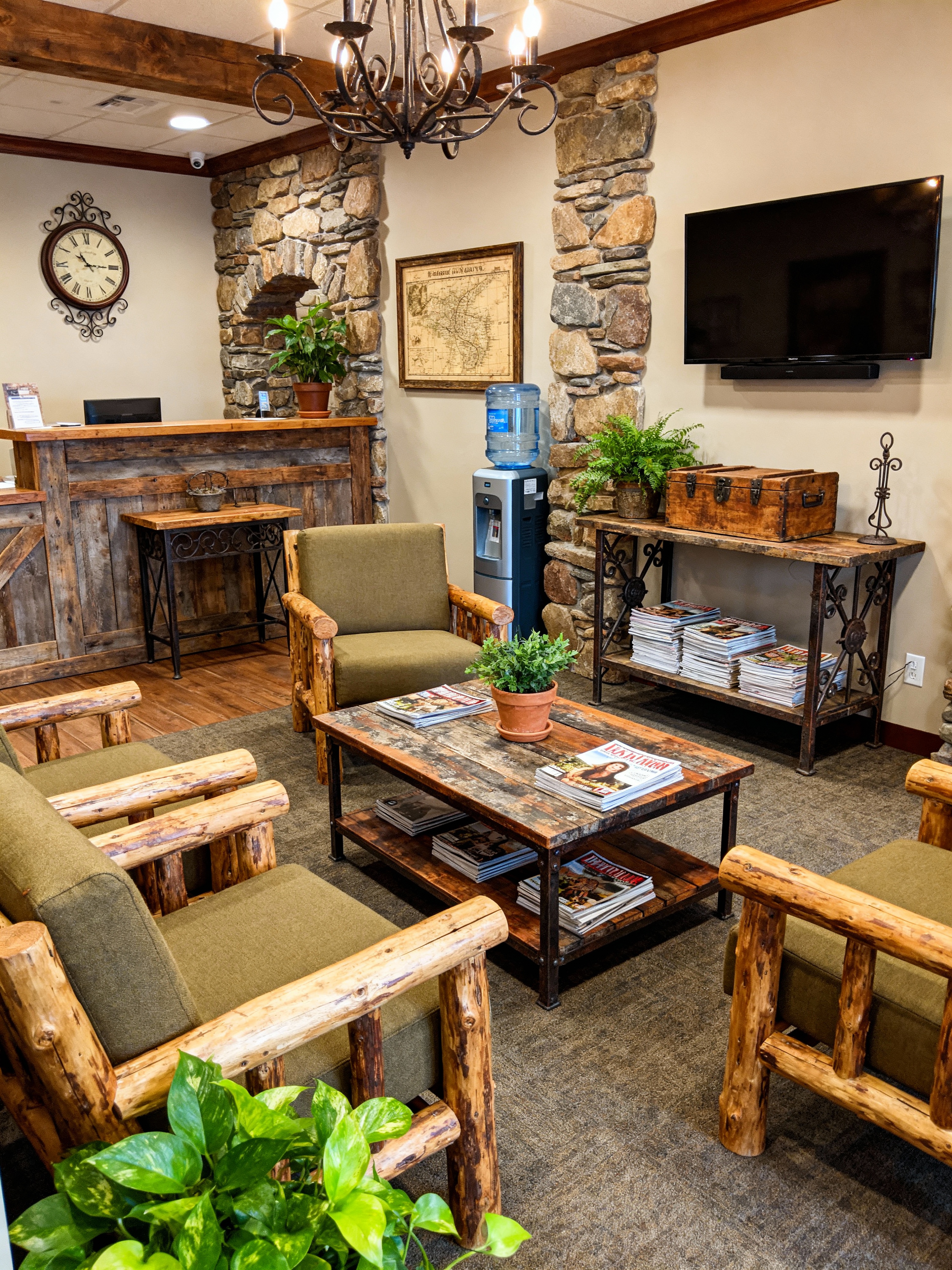 waiting room with rustic style with reception desk and clock and side tables and coffee table and water cooler and television and plants and magazines. . with stone accents and cozy cabin and iron fixtures and warmth and vintage decor and natural wood and distressed finishes and earthy tones