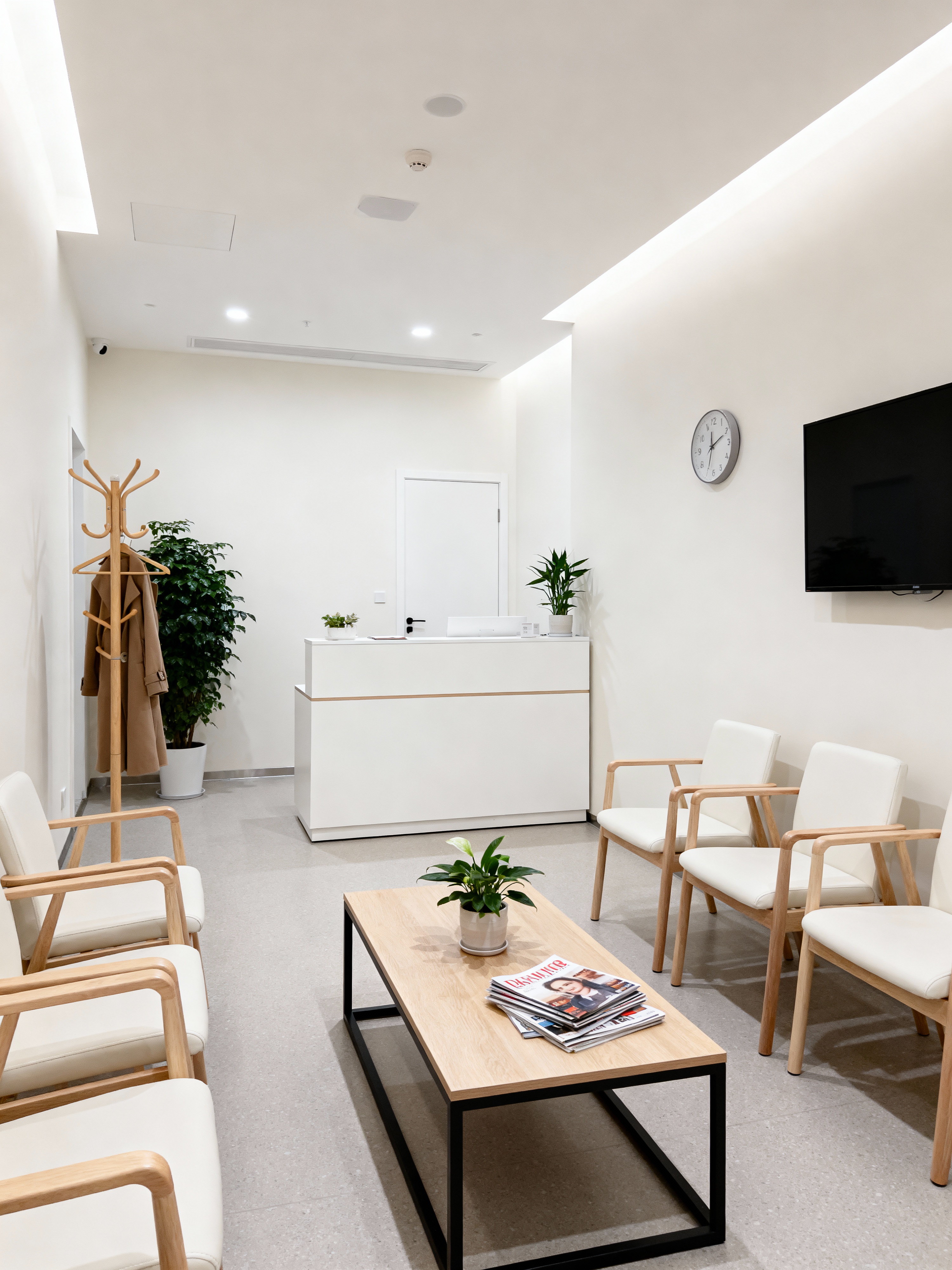 waiting room with simple style with reception desk and coffee table and chairs and coat rack and plants and magazines and clock and television. . with basic elements and neutral colors and streamlined look and essential pieces and functional furniture and uncluttered space and pure simplicity and clean design