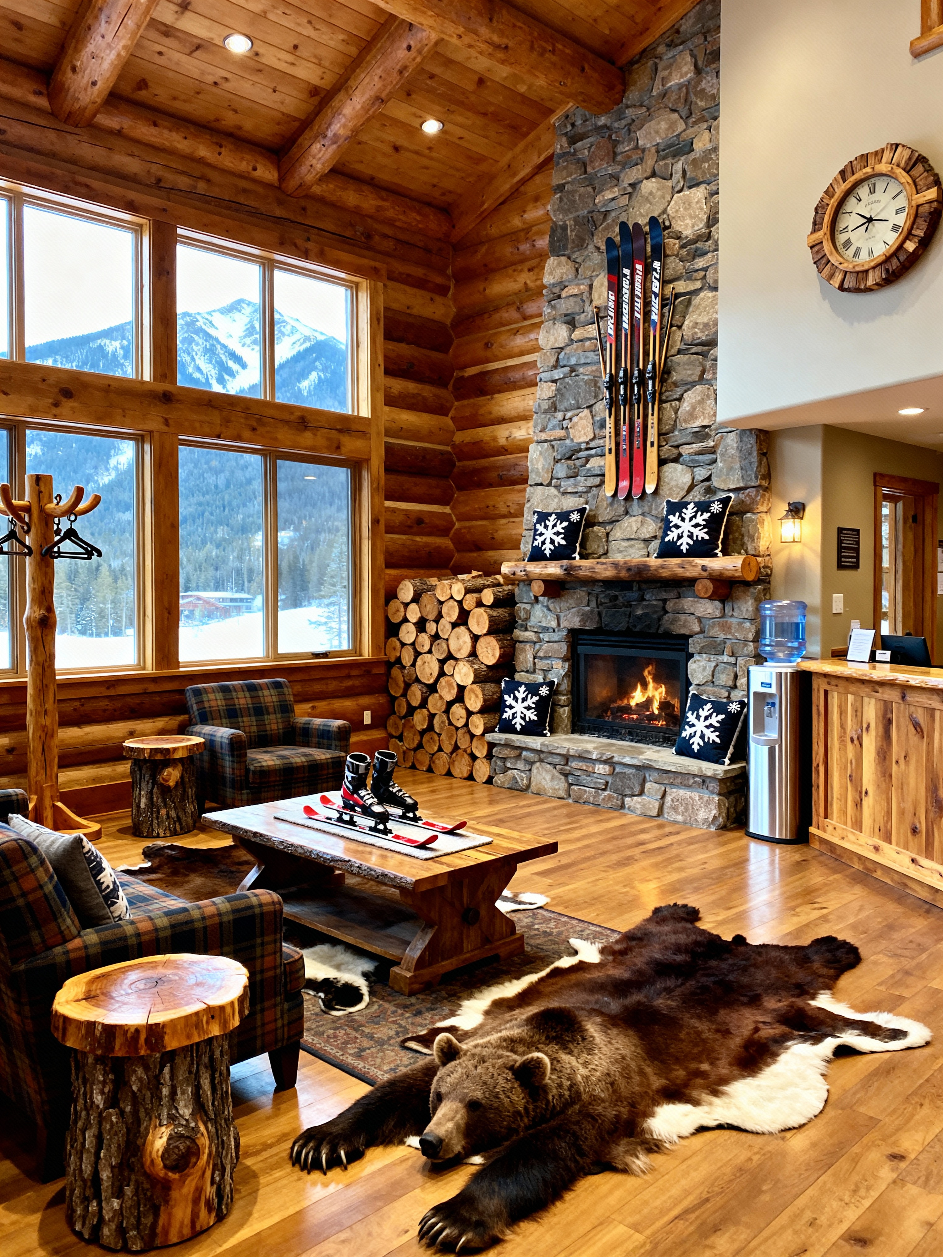 waiting room with ski chalet style with coat rack and side tables and coffee table and television and chairs and reception desk and water cooler and clock. . with exposed wood and wooden logs and rustic and ski-themed decor and window with mountain views and wood beams and animal rugs and stone fireplace