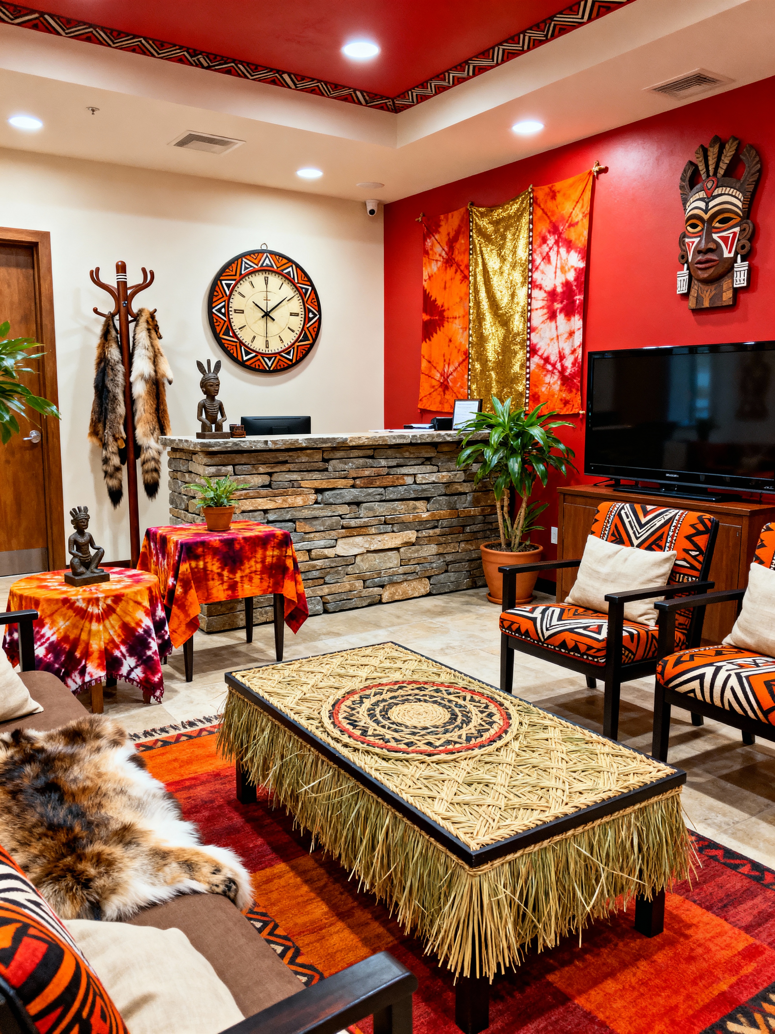 waiting room with tribal style with coffee table and clock and side tables and reception desk and coat rack and television and plants and chairs. . with tribal patterns and exuberant splashes of colour and sculptures and artworks and animal furslinen and tribal revival and intricate grass weaving and hand dyed batik fabrics and planks of stone