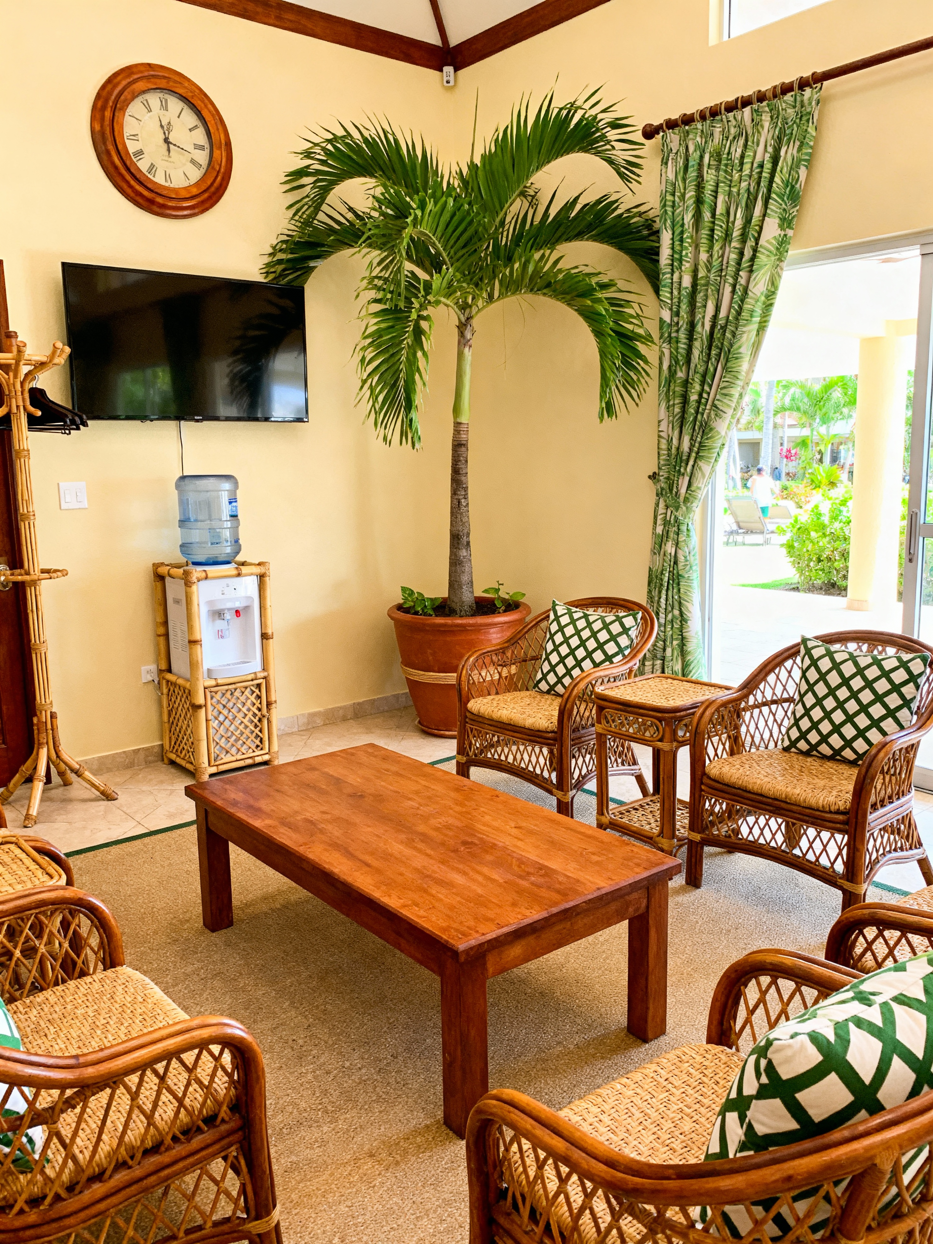 waiting room with tropical style with plants and television and clock and coffee table and chairs and side tables and water cooler and coat rack. . with cane motifs and palm leaves and rattan and wicker and palm trees and bamboo and lattice prints and teak