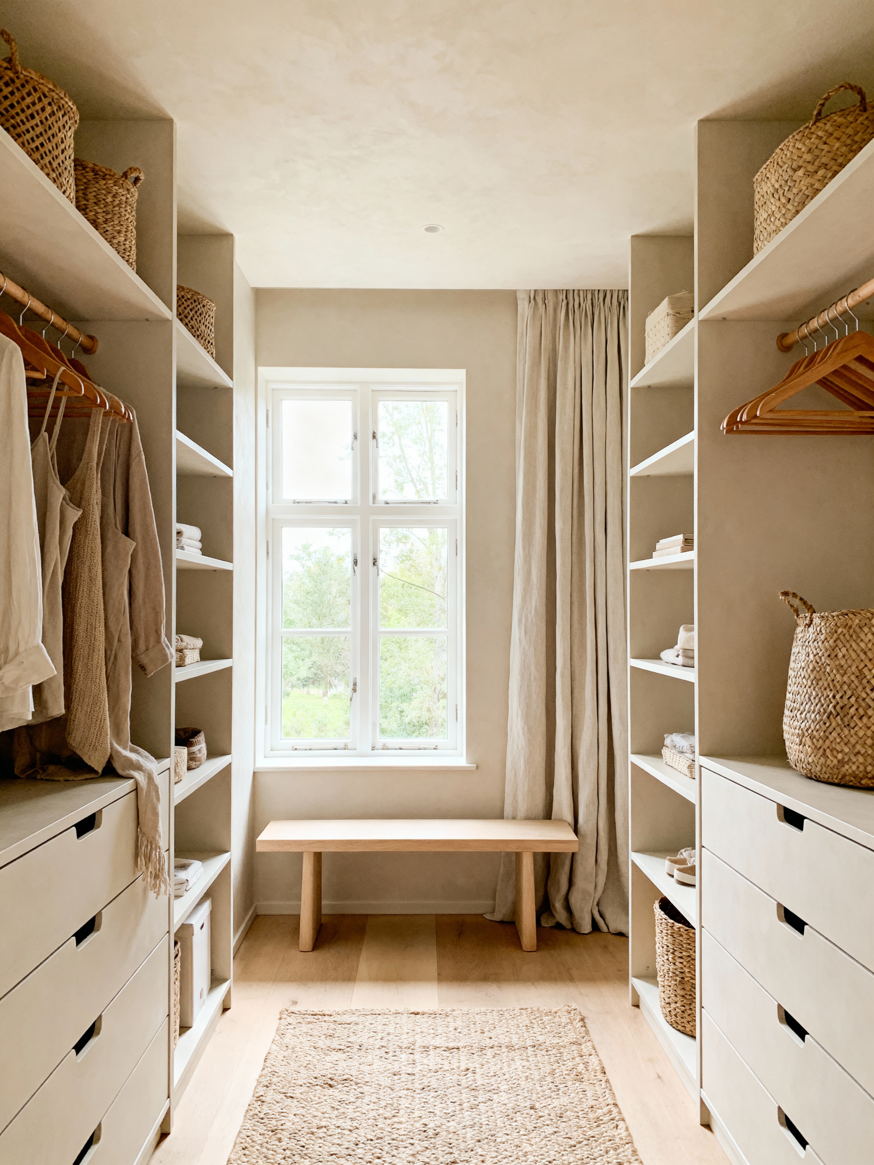 walk in closet with airbnb style . with open and natural lighting and practicality and functionality and simple color palette and simple, clean lines and simplistic furniture and scandinavian style and neutral walls and textures and natural materials and elements and open and natural lighting