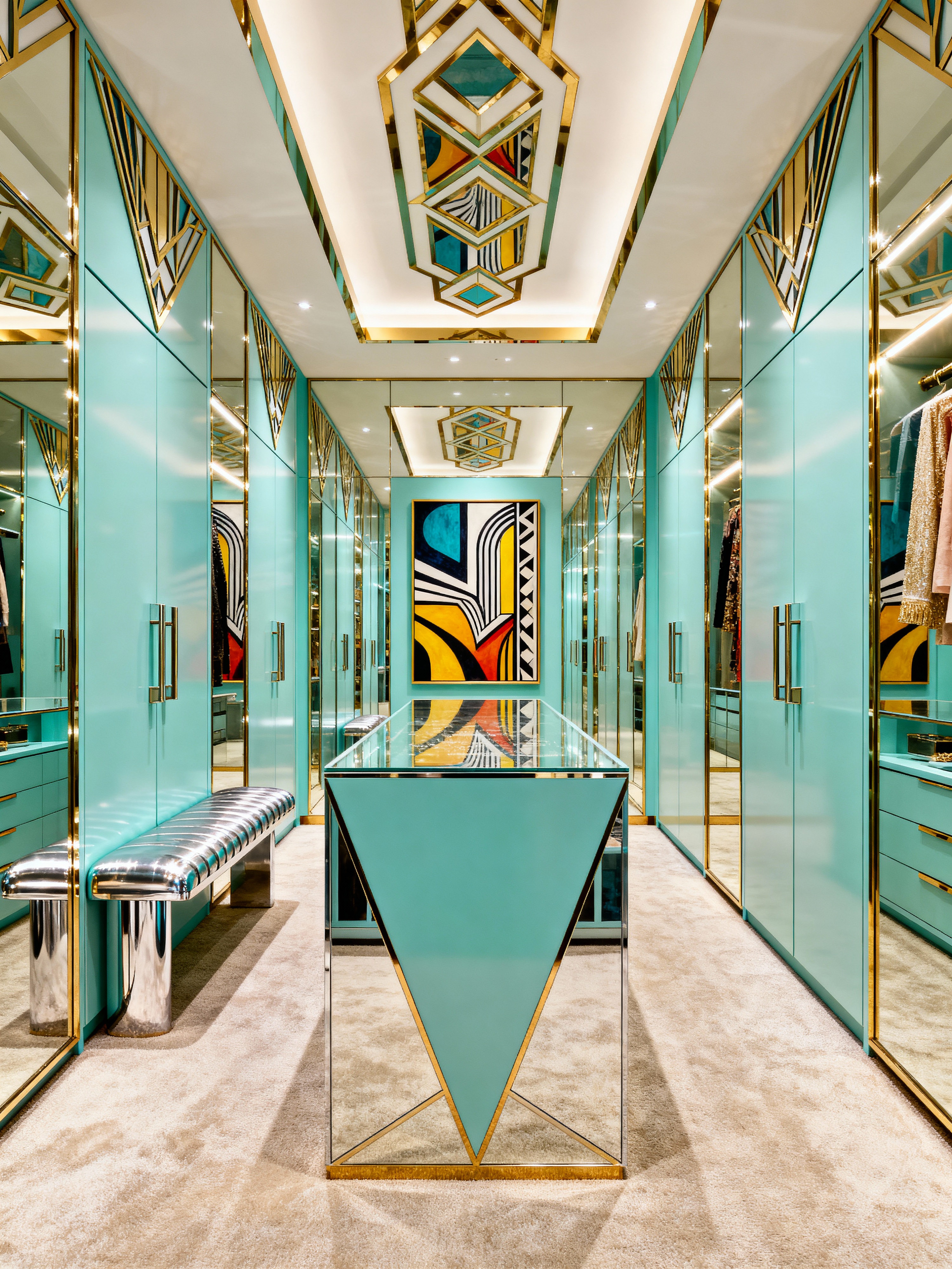 walk in closet with art deco style . with angular shapes and abstract patterns and exuberant shapes and decadent detail and bright and cheerful colors and stream-lined forms and geometric lines and geometric shapes
