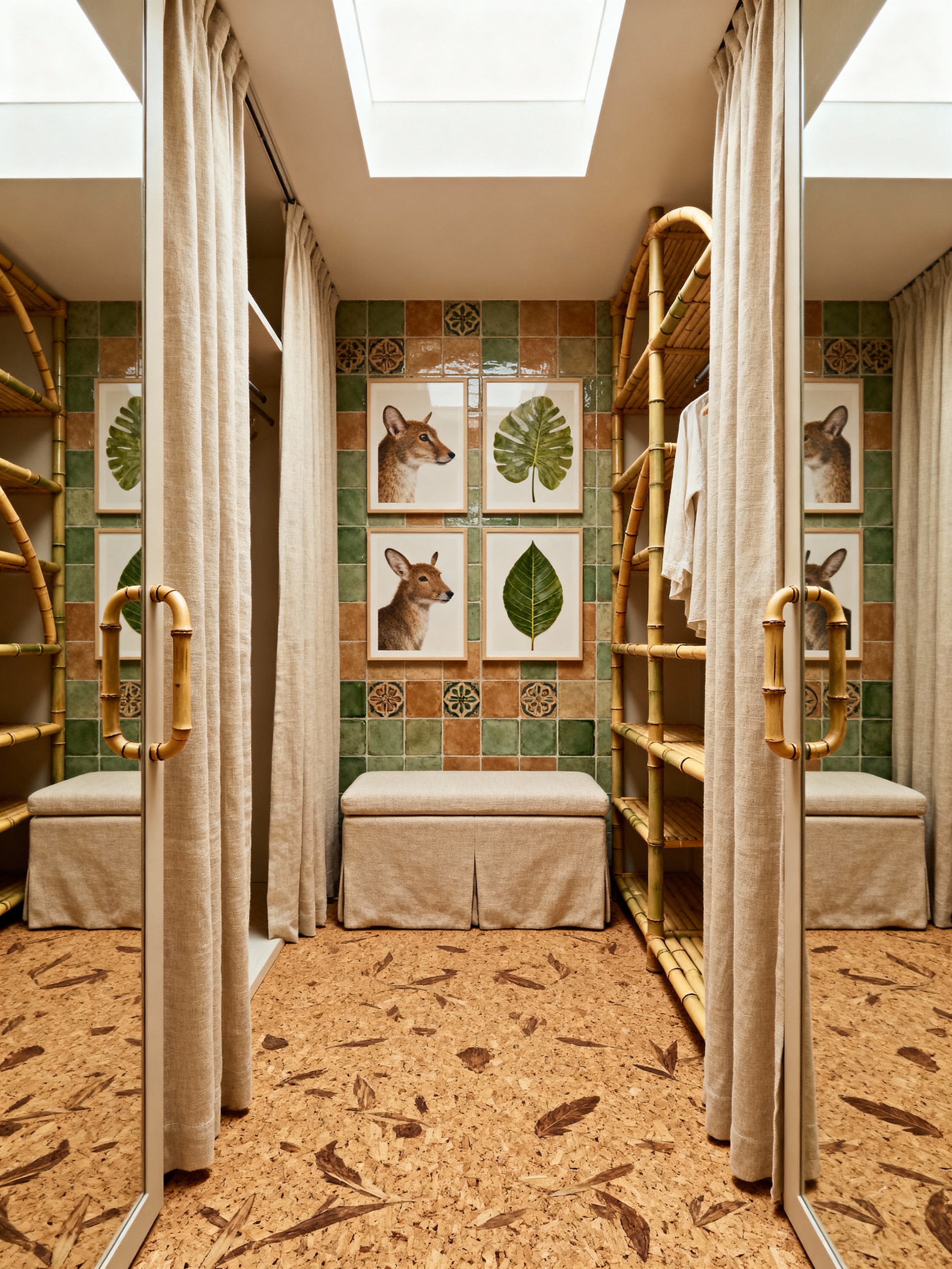 walk in closet with biophilic style . with linen materials and images of animals and natural shapes and forms and cork materials and natural patterns and ceramic materials and images of nature and bamboo materials