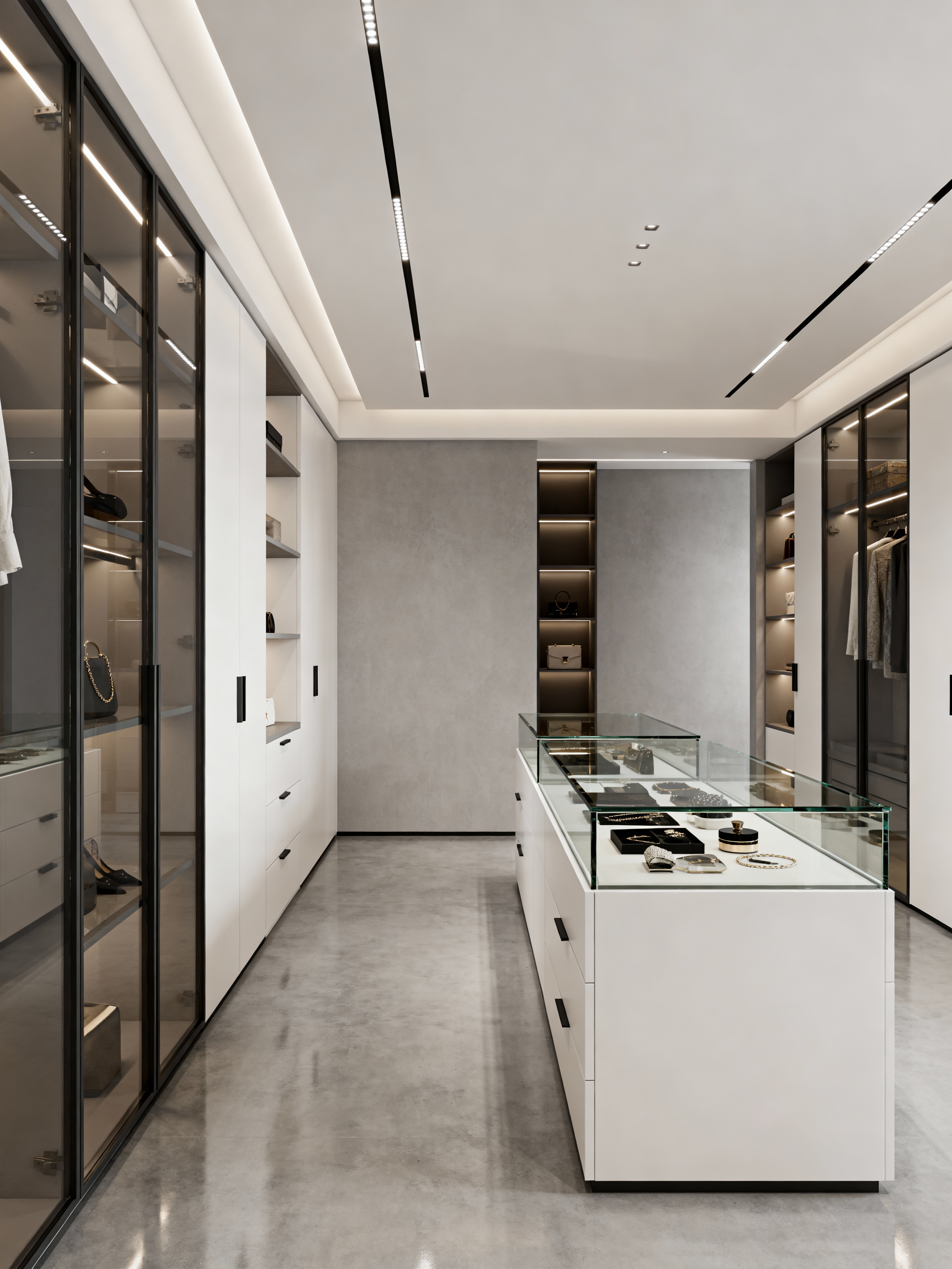 walk in closet with contemporary style . with neutral palette and minimalist and sleek lines and open spaces and high contrast and glass decor and functional design and elegant simplicity