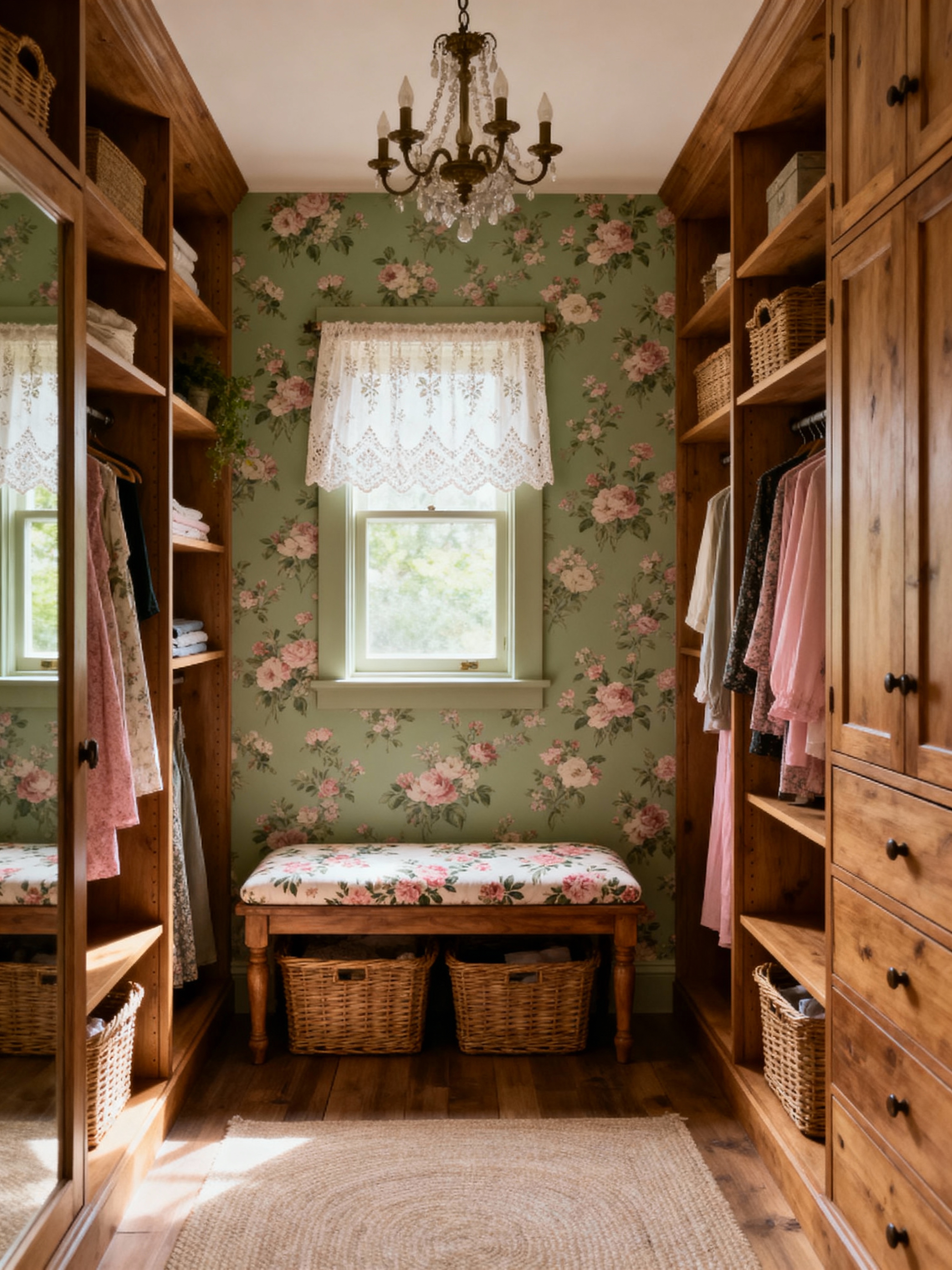 walk in closet with cottagecore style . with organic and traditional and natural and muted colors and earthy and country style and cottage style and floral patterns