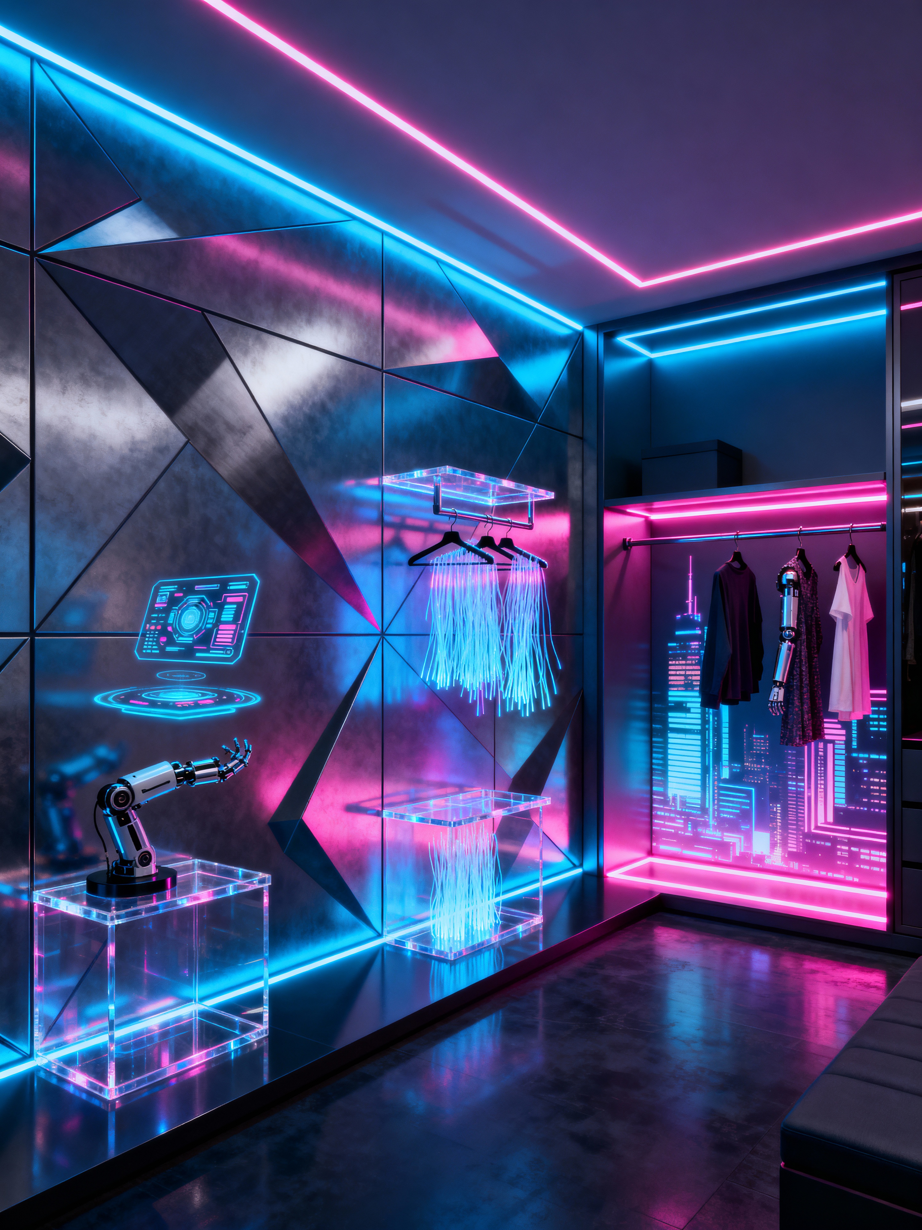 walk in closet with cyberpunk style . with futuristic cybernetic city and color lights glow and led lights and synthetic objects and strong geometric walls and cyberpunk style and futuristic cybernetic details and bladerunner style