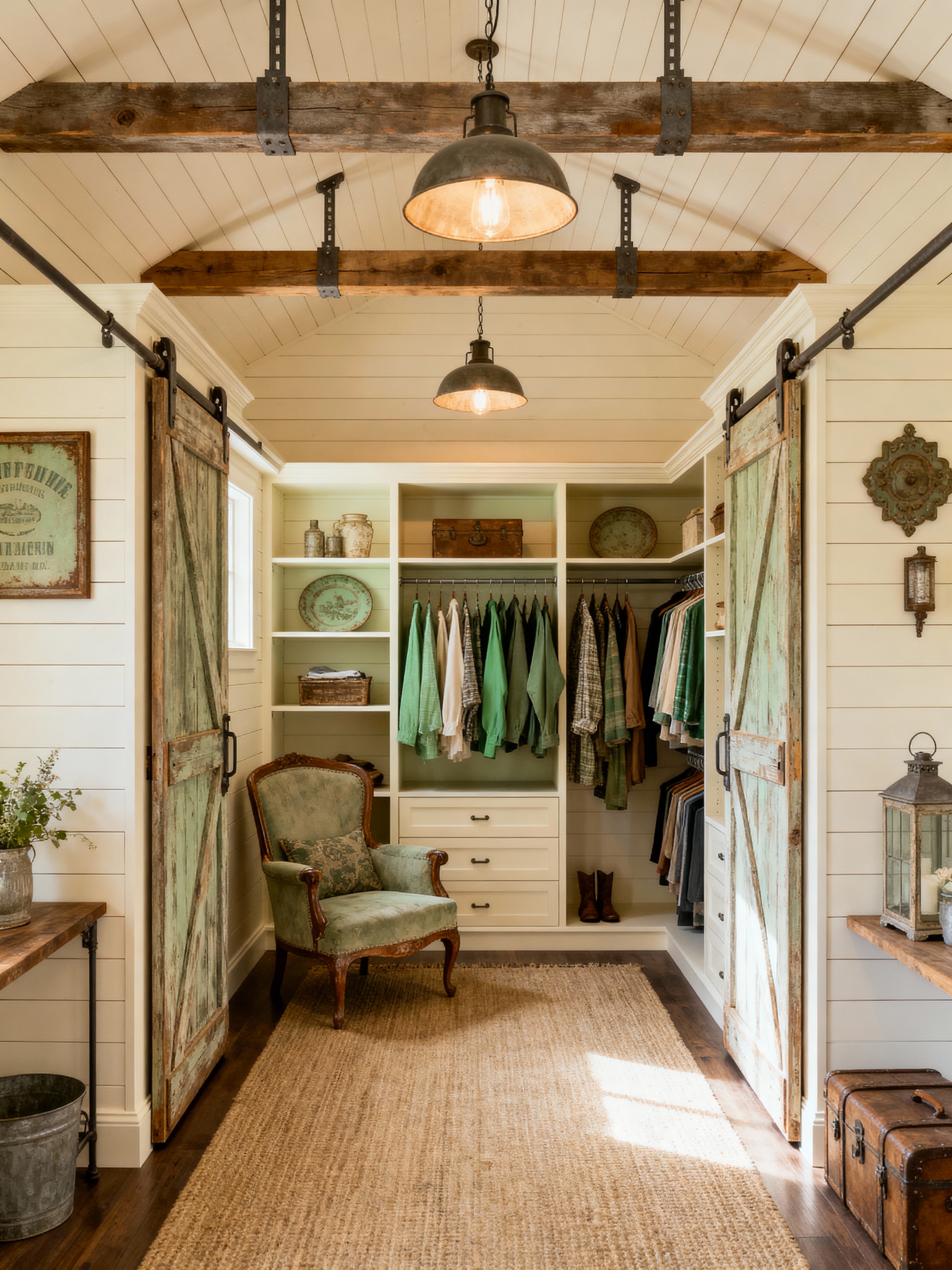 walk in closet with farmhouse style . with open shelving and vintage decor and cozy feel and industrial accents and barn doors and shiplap walls and country style and exposed wood