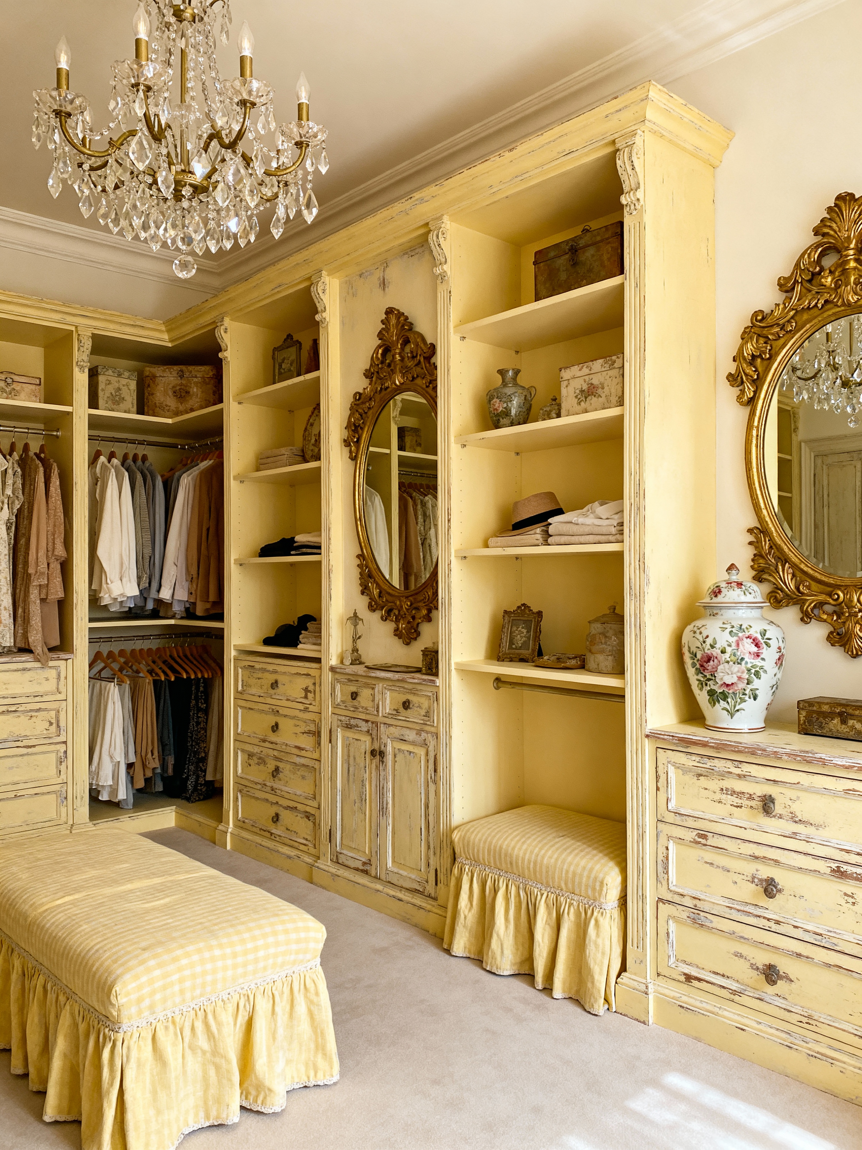 walk in closet with french country style . with distressed wood and elegant rustic and warm tones and ornate details and soft fabrics and chandeliers and antique decor and country elegance