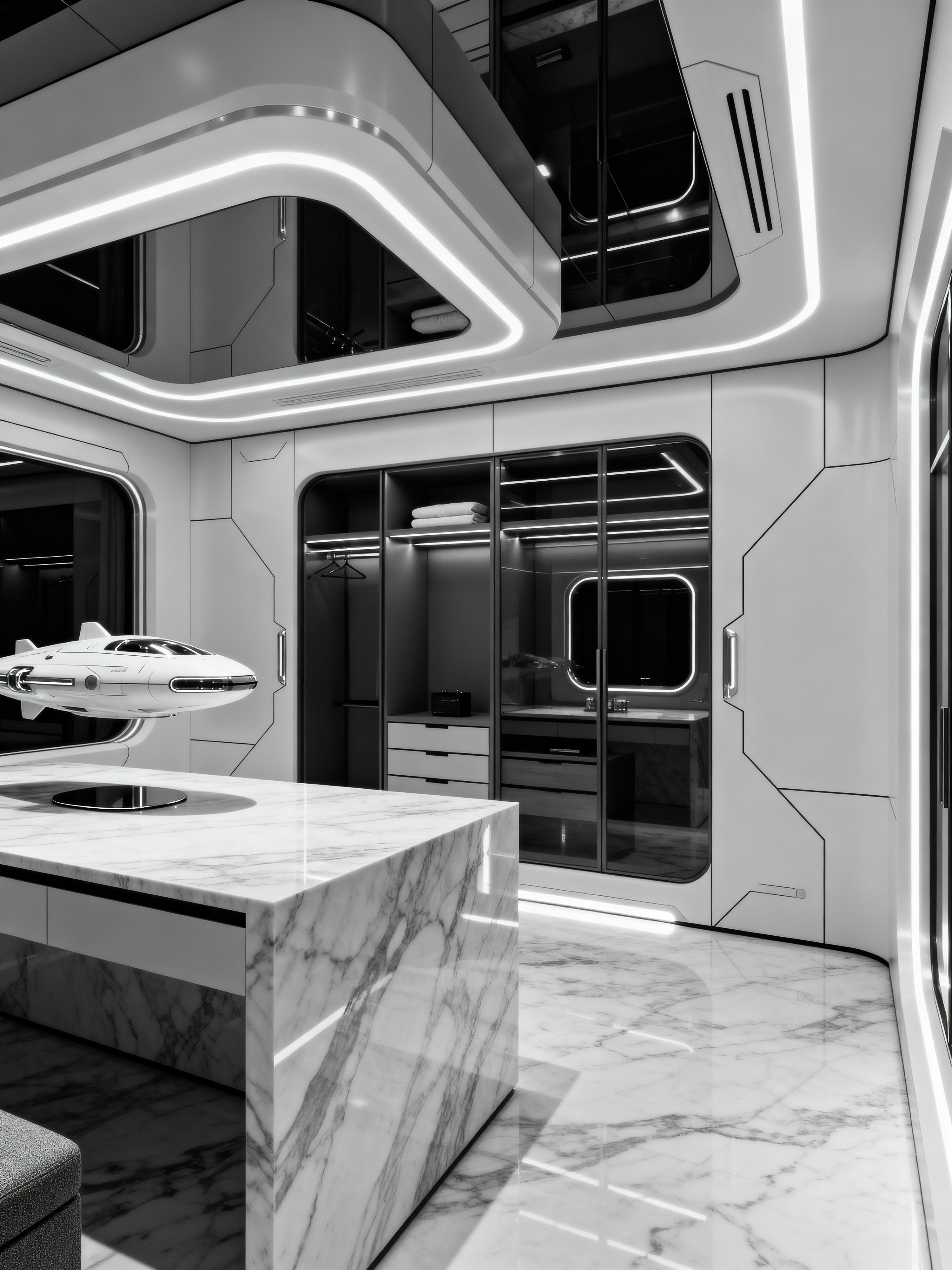 walk in closet with futuristic style . with smooth marble and monochromatic palette and minimalist clean lines and futurism and futurism minimalist interior and spaceship interior and strong geometric walls and floating surfaces