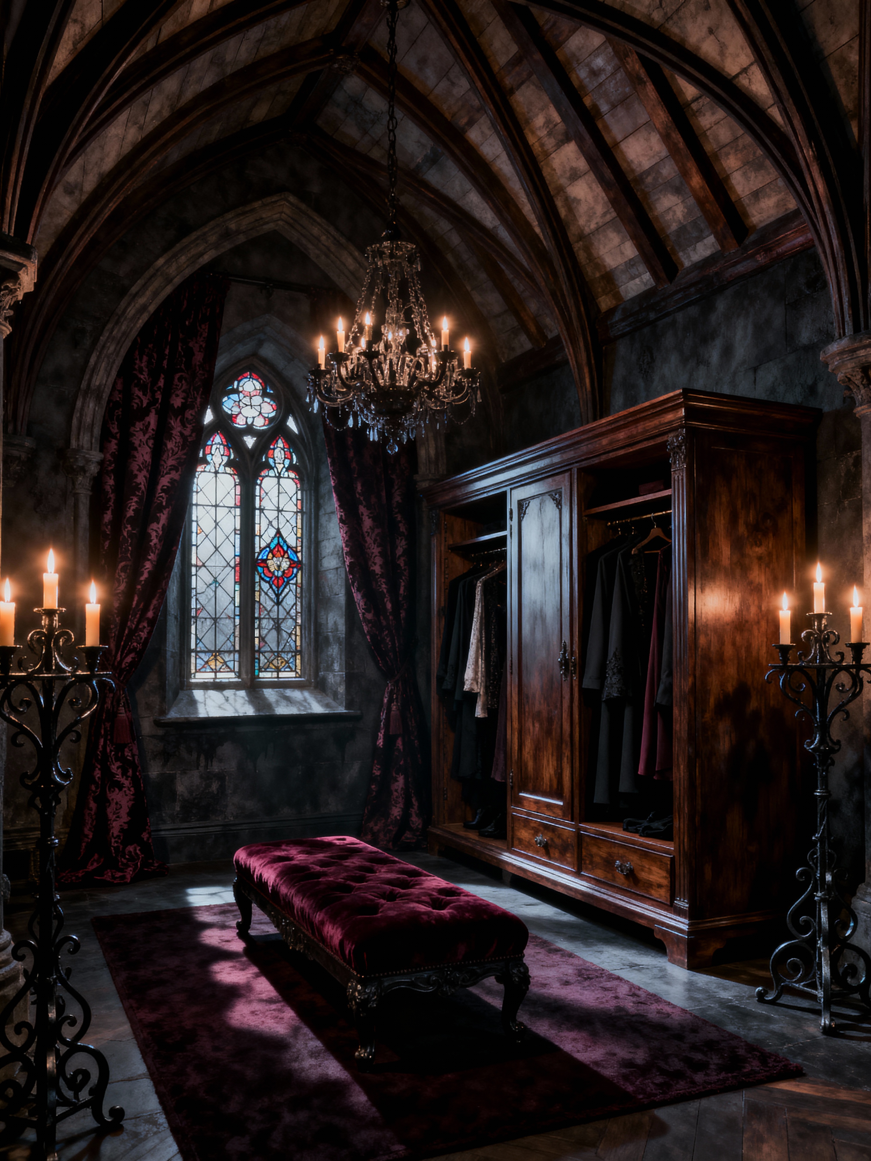 walk in closet with gothic style . with medieval influence and mysterious mood and candlelit ambiance and rich fabrics and dramatic atmosphere and heavy furniture and dark colors and cathedral style