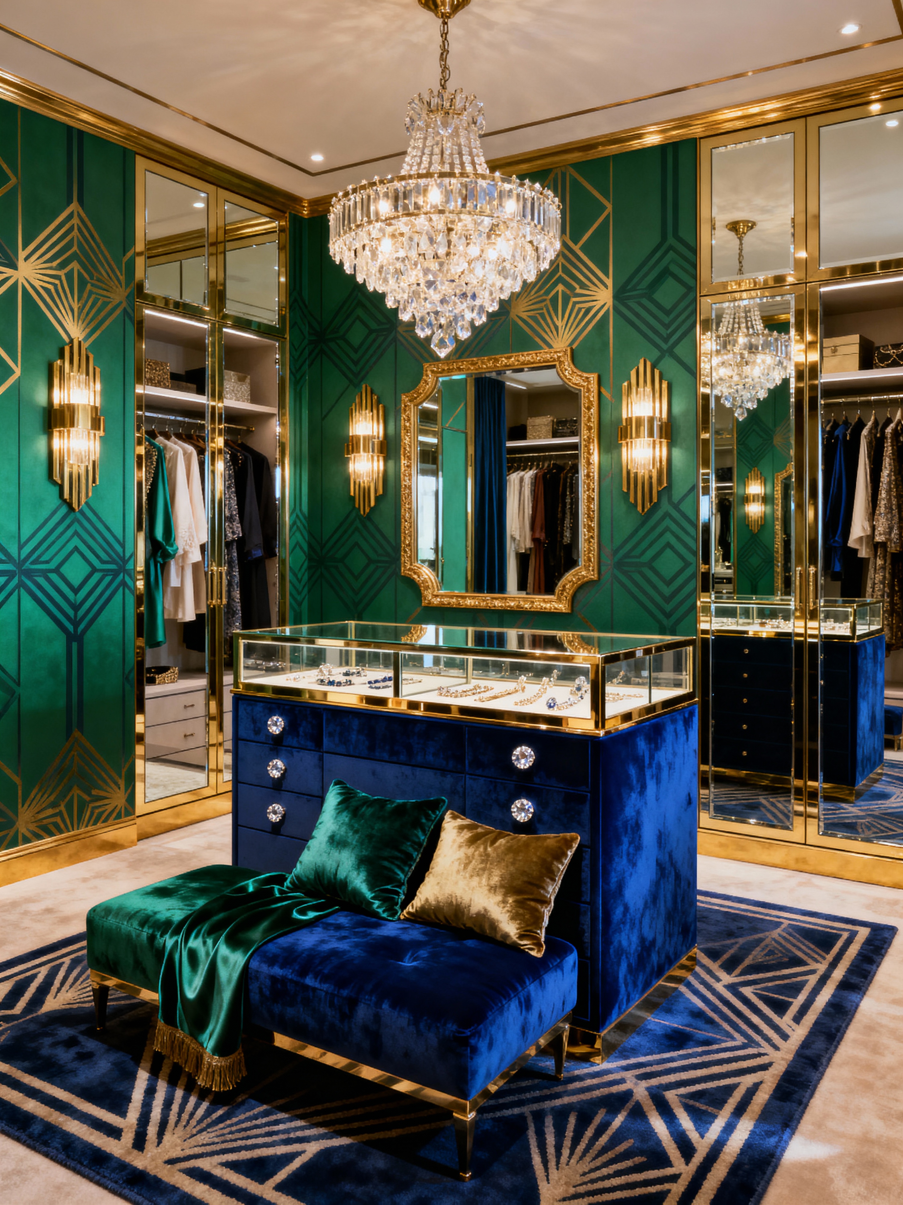 walk in closet with hollywood glam style . with bold colors and metallic accents and crystal chandeliers and mirrored surfaces and luxurious fabrics and velvet upholstery and glamorous style and art deco influence