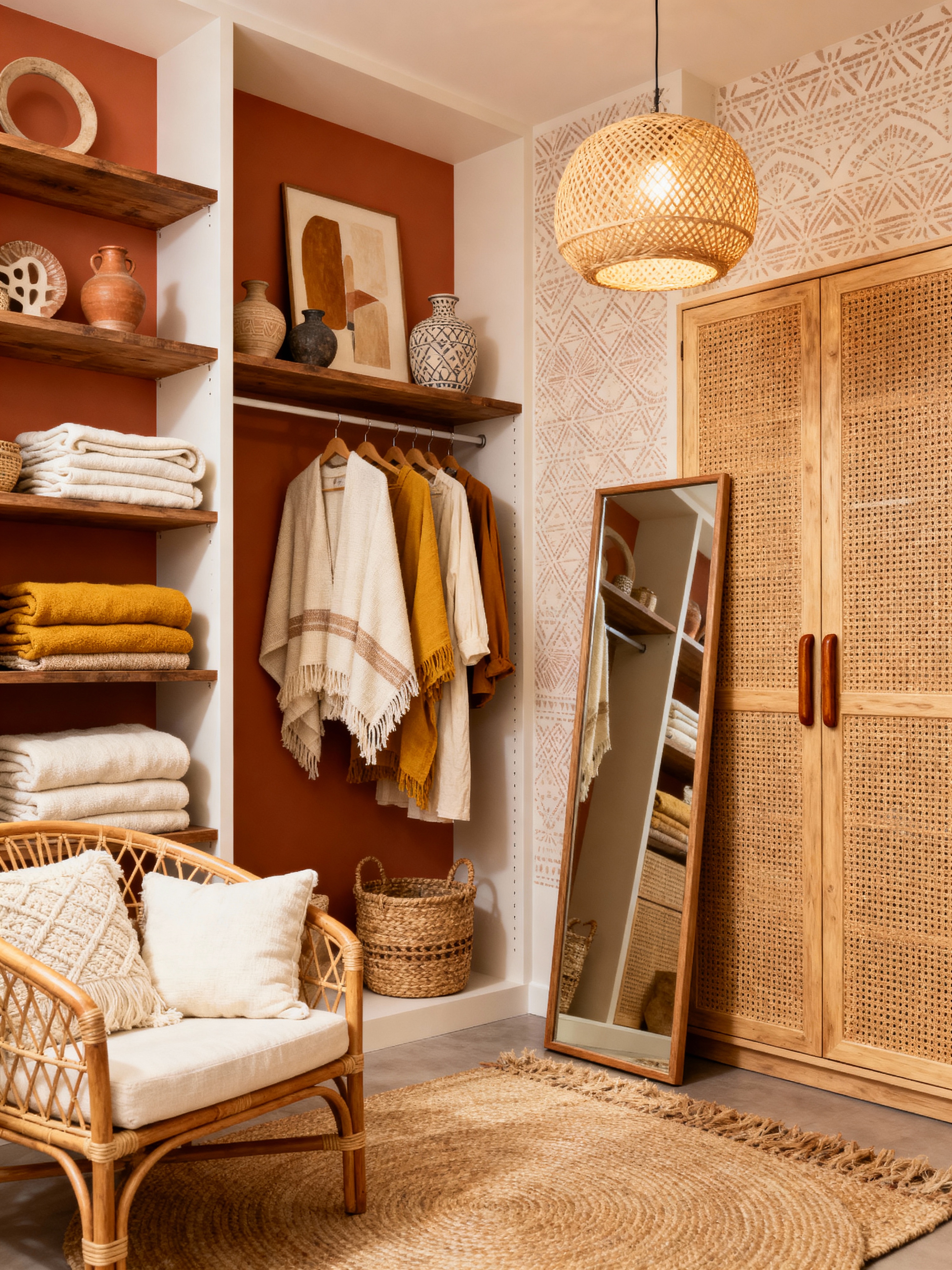 walk in closet with modern boho style . with cotton textiles and earthy tones and woven textures and expressive decor and warm colors and rattan furniture and wood decor and unique finds