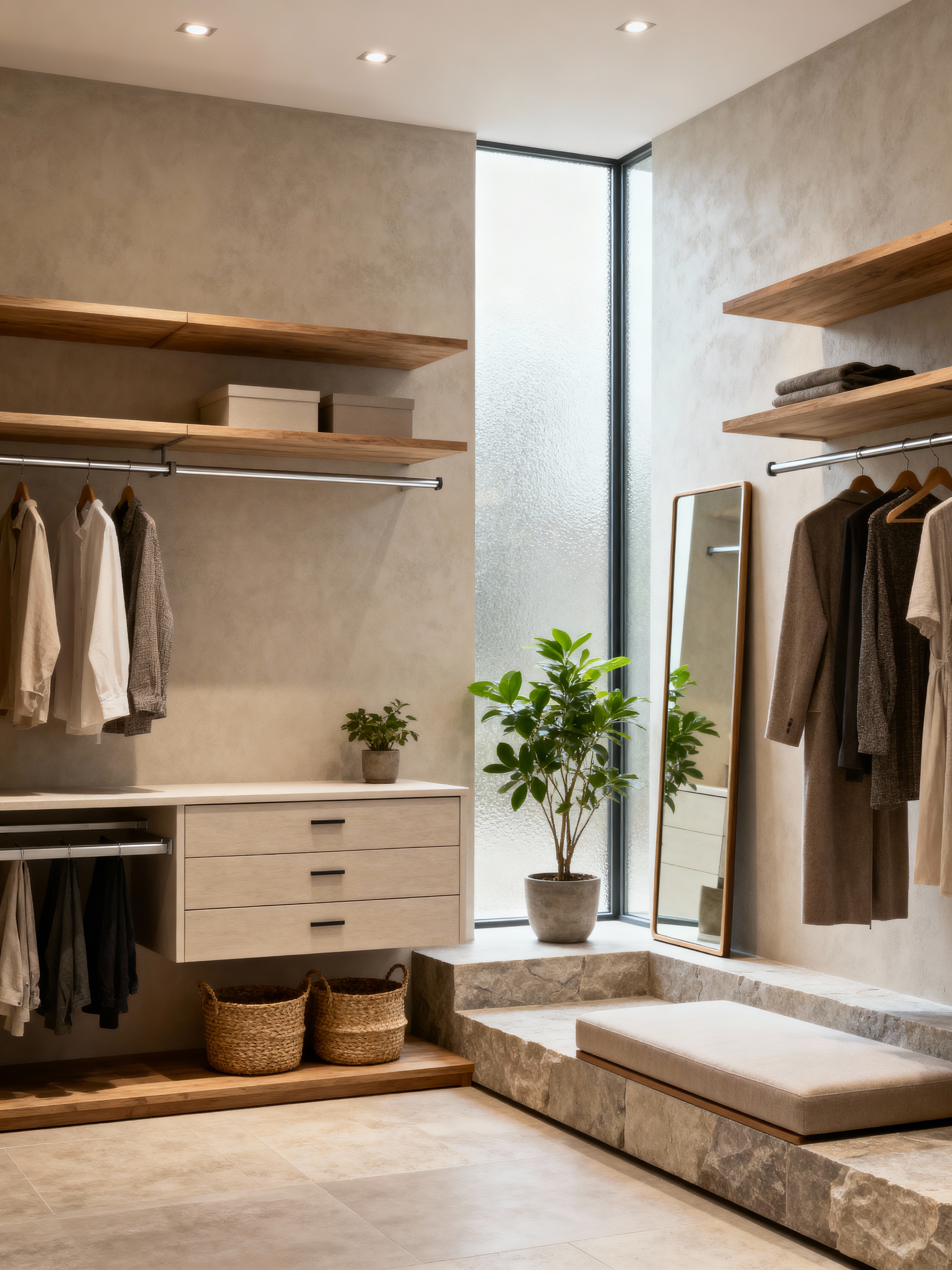 walk in closet with modern style . with simple, clean lines and simplistic furniture and practicality and functionality and neutral walls and textures and natural materials and elements and open and natural lighting and simple, clean lines and simplistic furniture