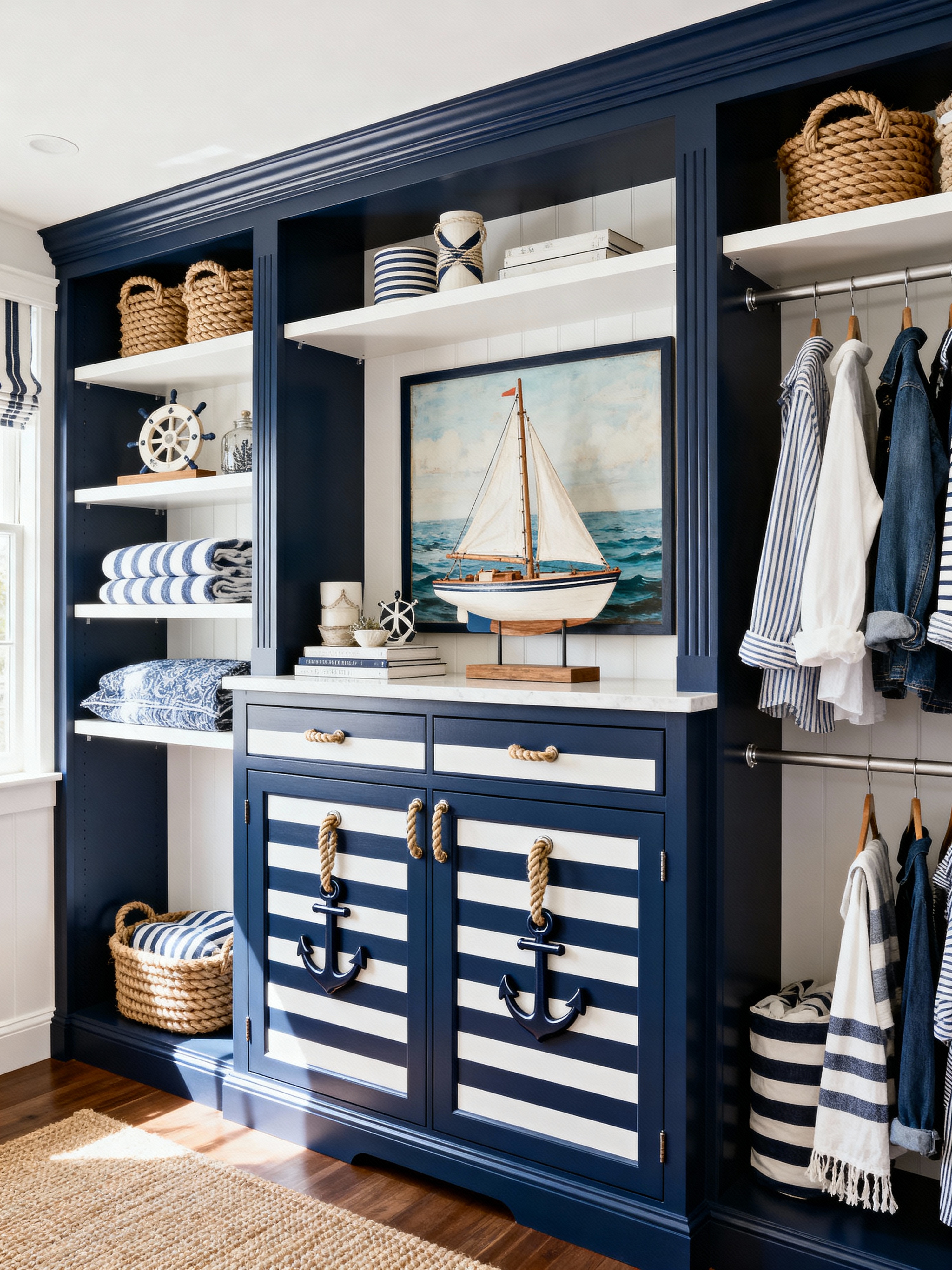walk in closet with nautical style . with striped patterns and sailboat elements and ocean inspiration and navy blue and rope details and crisp white and anchor motifs and seaside charm