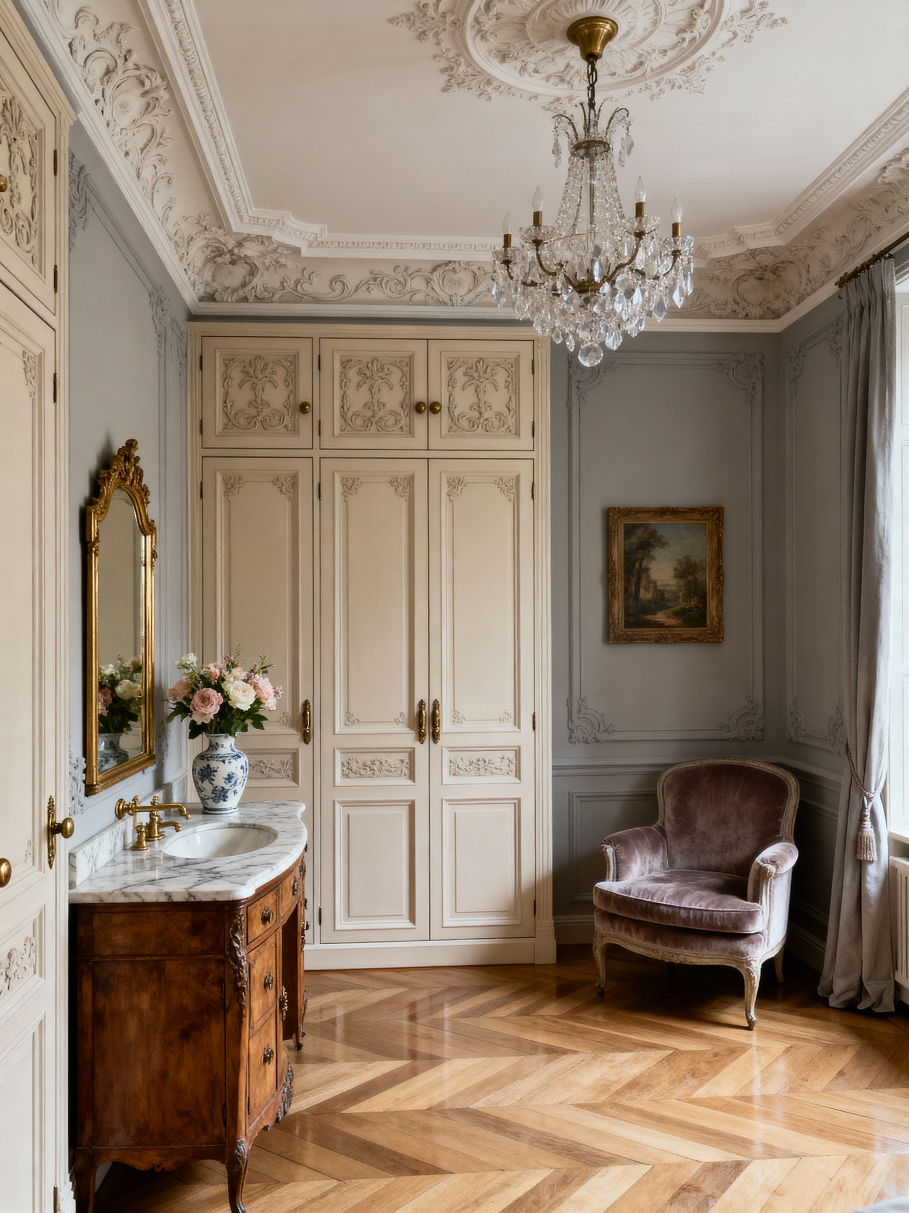 walk in closet with parisian style . with european flair and antique furniture and vintage pieces and sophisticated charm and french elegance and timeless beauty and ornate moldings and neutral palette