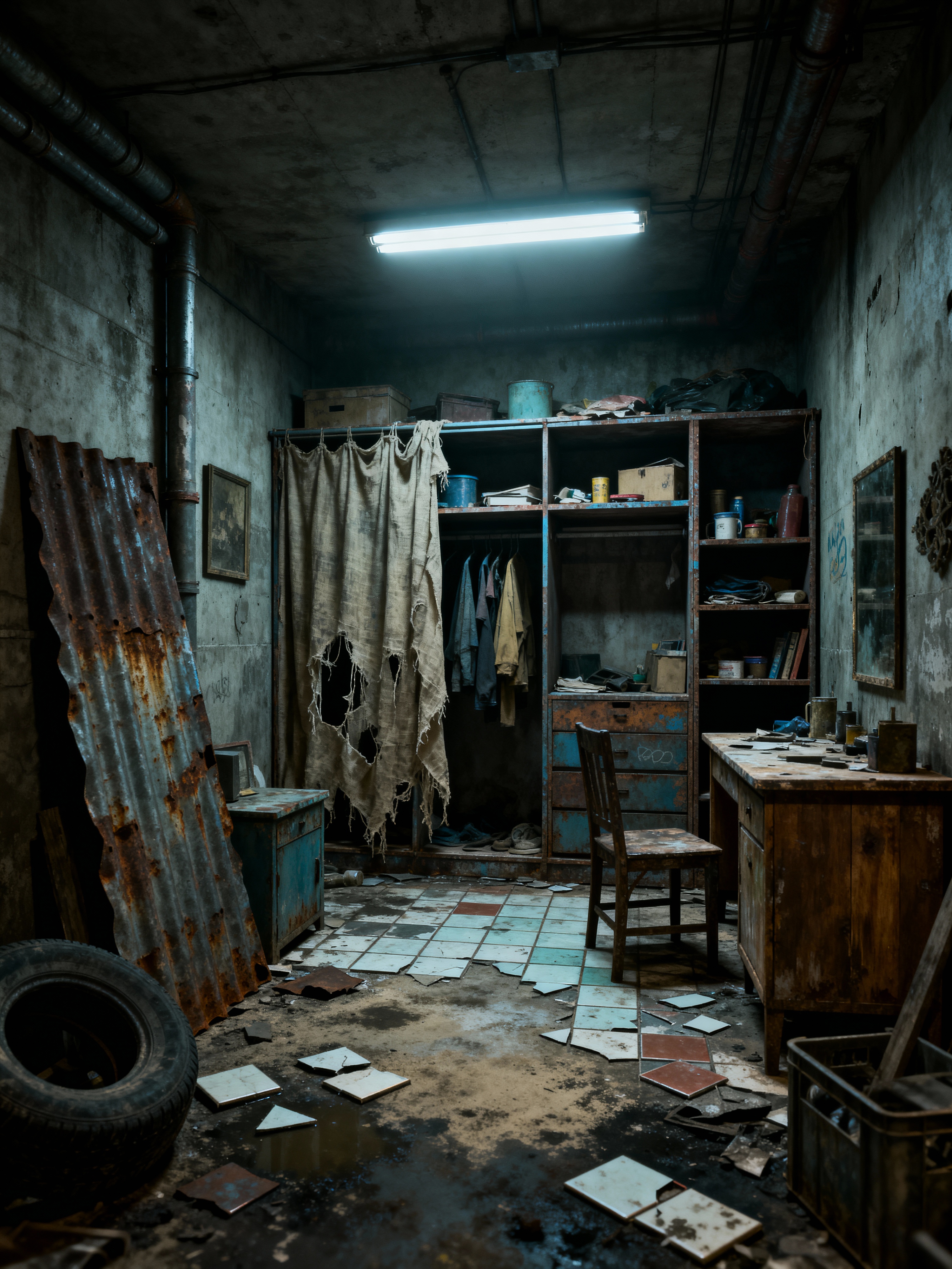 walk in closet with post-apocalyptic style . with cheap mismatched furniture and broken tiles and dirty floor and scavenged decor and run-down favela style and poverty-stricken and industrial elements and dim lighting