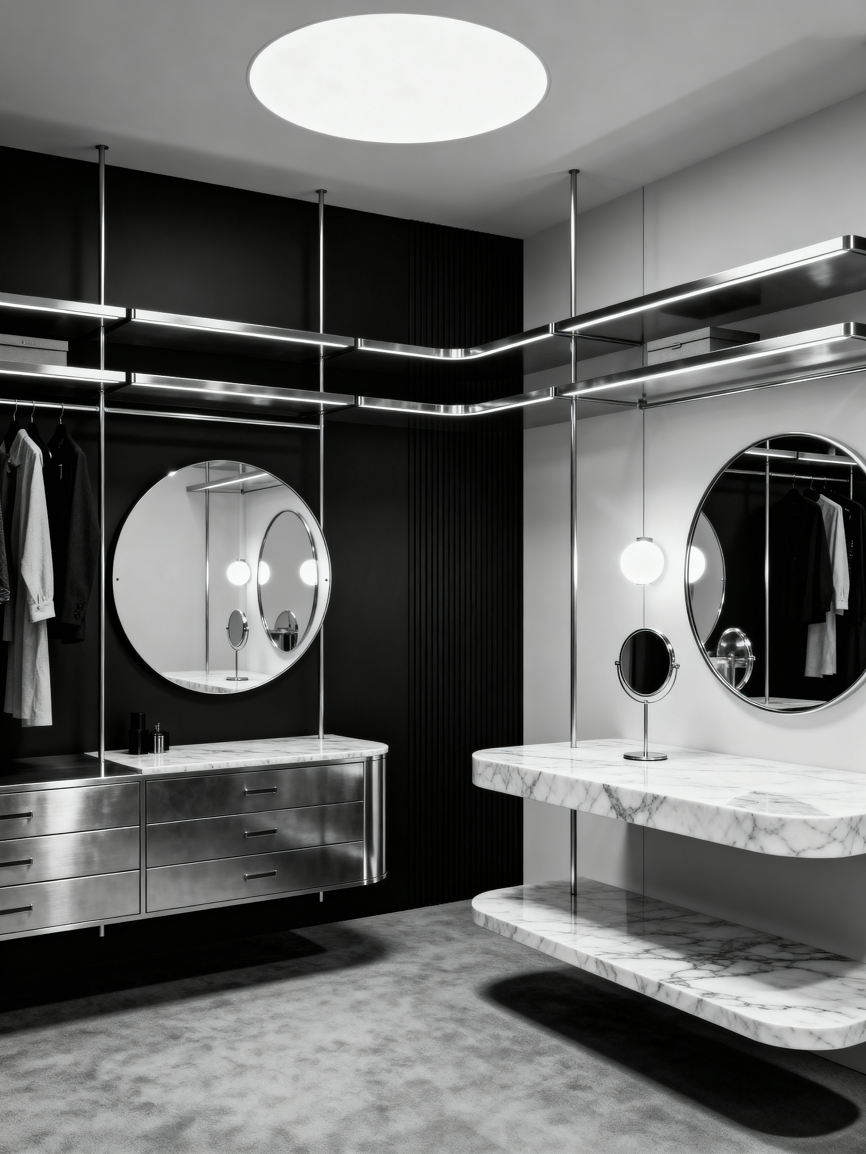 walk in closet with retro futuristic style . with futuristic interior and monochromatic palette and minimalist clean lines and circular shapes and vintage futurism and steel finishing and floating surfaces and smooth marble