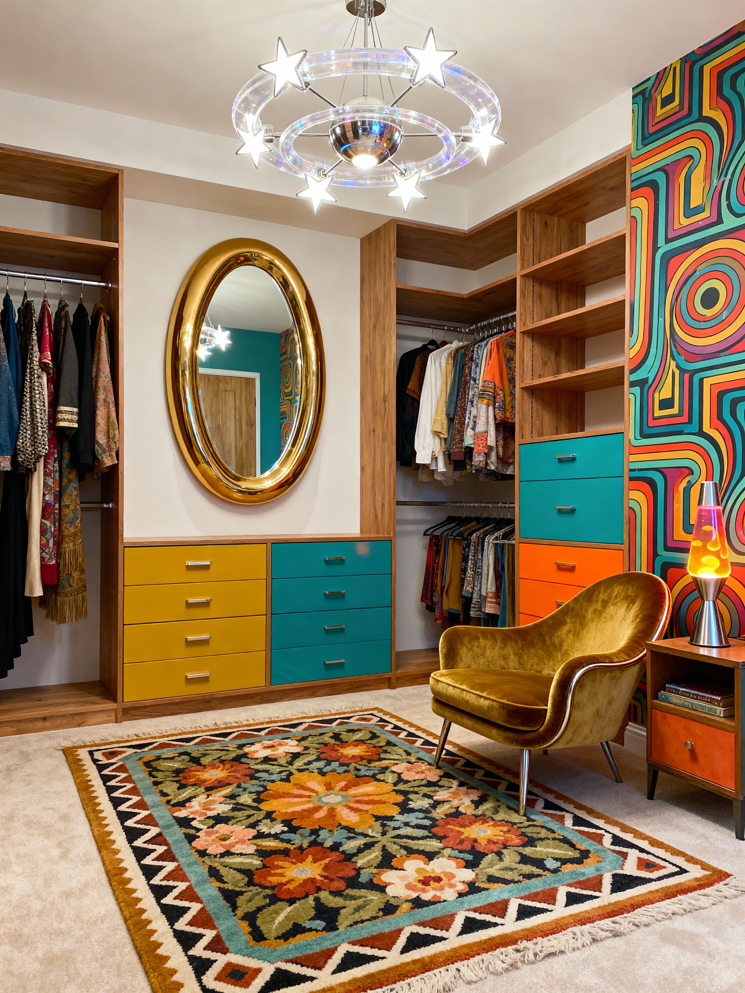 walk in closet with retro style . with nostalgic pieces and bold patterns and mod style and geometric shapes and groovy vibes and bright colors and space age and vintage revival