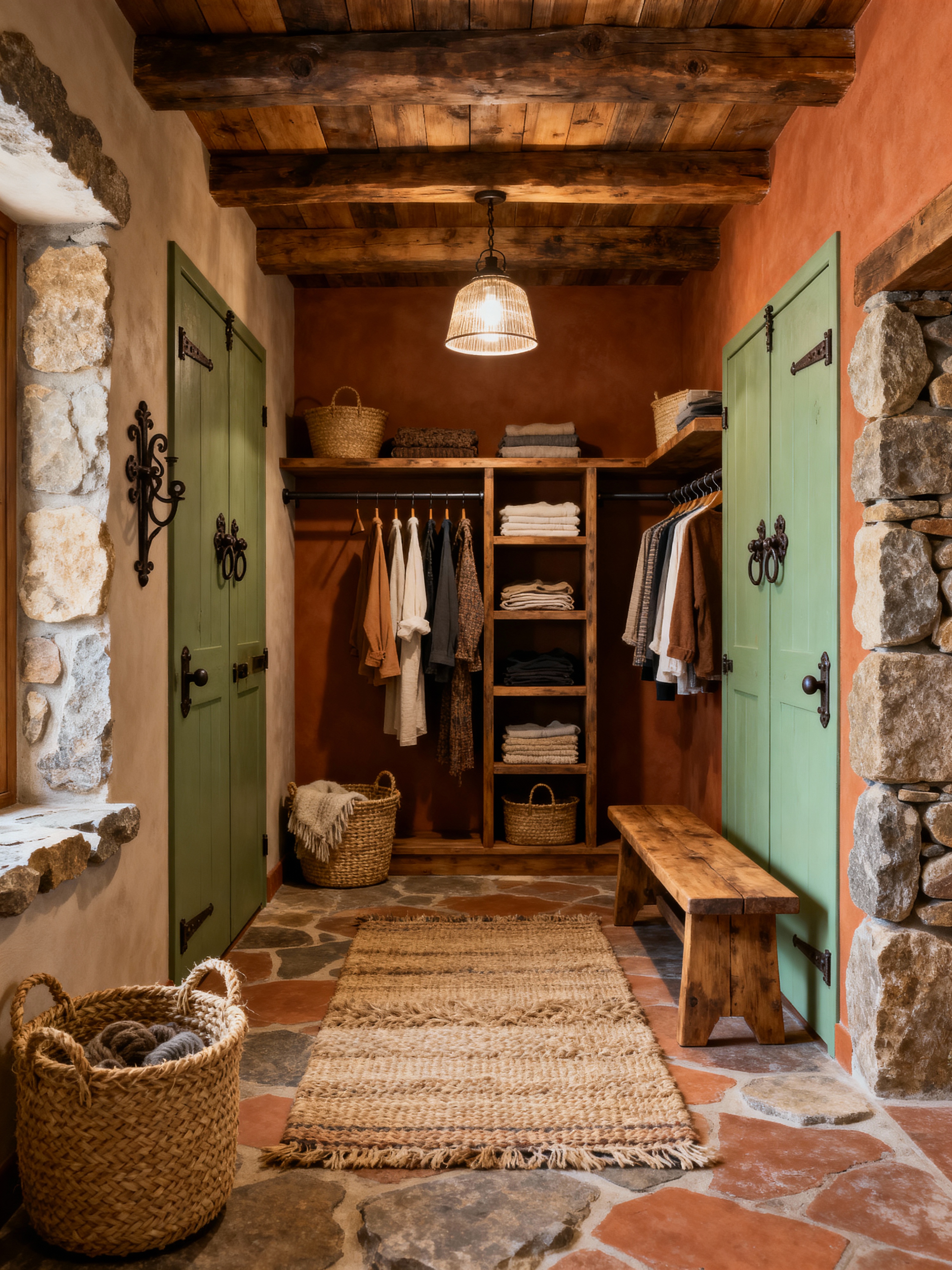 walk in closet with rustic style . with stone accents and exposed beams and cozy cabin and earthy tones and woven textures and iron fixtures and country style and warmth